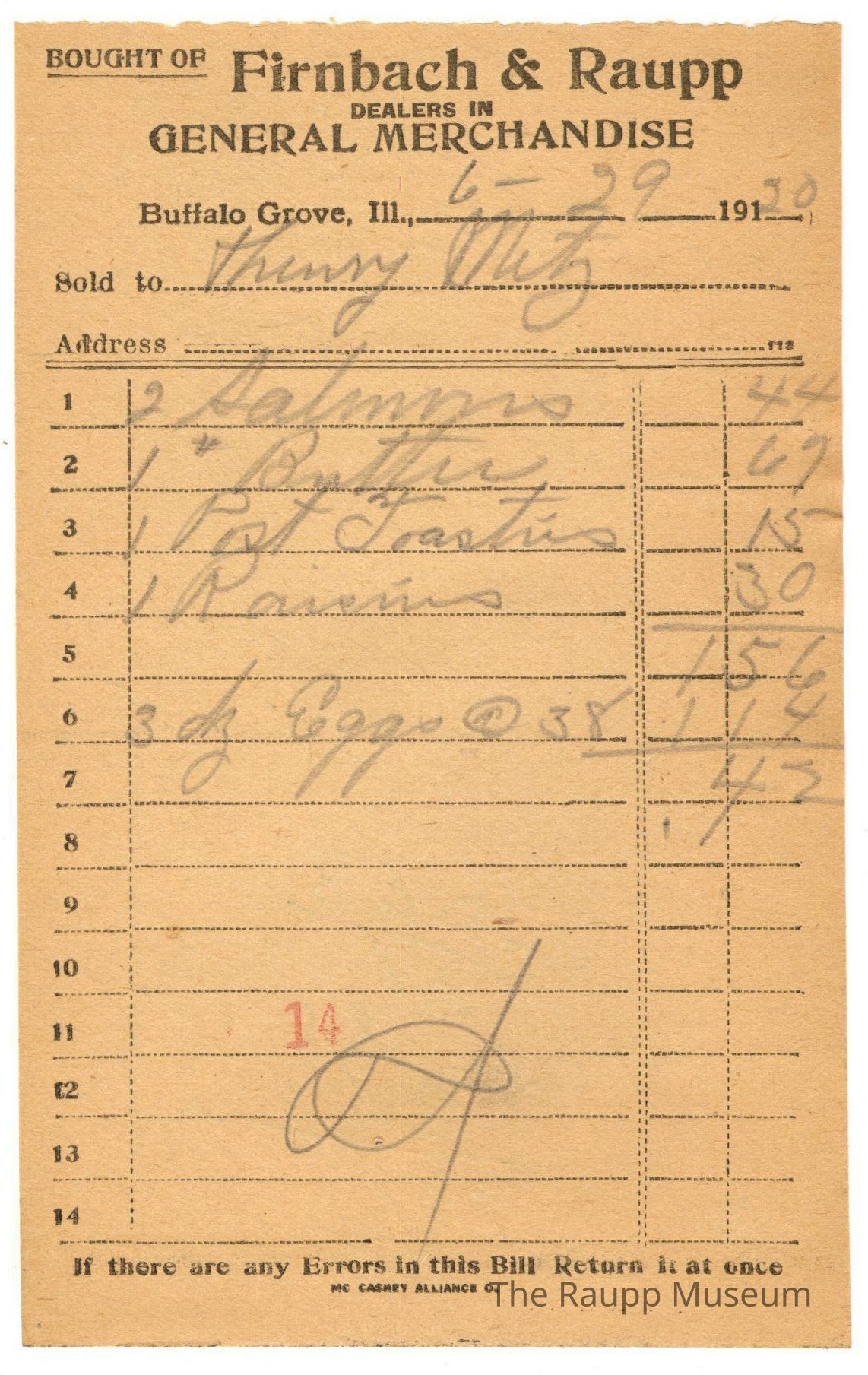 The black text is as follows, from top to bottom: Bought of Firnbach & Raupp, Dealers in GENERAL MERCHANDISE; Buffalo Grove Ill.; Sold to; Address; If there are any Errors in this Bill Return it at once; MC CASKEY ALLIANCE O.Archive Details