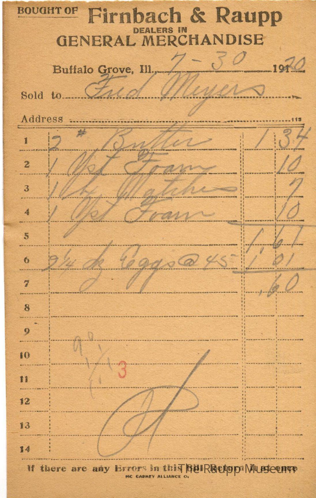 One (1) Firnbach and Raupp store receipt from July 30, 1920. Receipt is rectangular with black printed text and written notes in pencil. The receipt is for Fred Meyers, who bought two pounds (#) of butter for $1.34, one yeast (yst) foam for $0.10, one box (bx) of matches for $0.07, and one yeast (yst) foam for $0.10. The bill total is $1.61. In addition, he brought in two and a quarter (2-1/4) dozen (dz) eggs at $0.45 each to obtain a credit of $1.01. The total bill paid when subtracted by his credit total is $0.60.