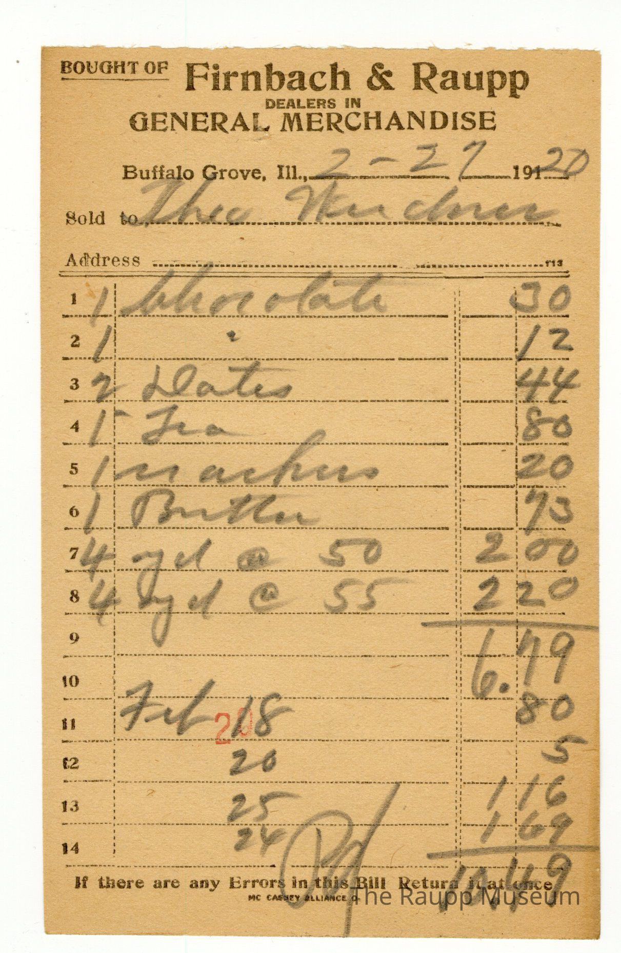 One (1) Firnbach and Raupp store receipt from February 10, 1920. Receipt is rectangular with black printed text and written notes in pencil. The receipt is for Theodore Weidner who bought one chocolate for $0.30, 1 chocolate for $0.12, two dates for $0.44, one tea for $0.80, one crackers for $0.20, one butter for $0.73, four gallons yards @ $ 0.50 for $2.00, and four yards @ $0.55 for $2.20. The bill was $6.99. There is a second bill, bringing the total to $10.48. There is a red stamp of 20 close to the bottom, with the bill marked as paid.