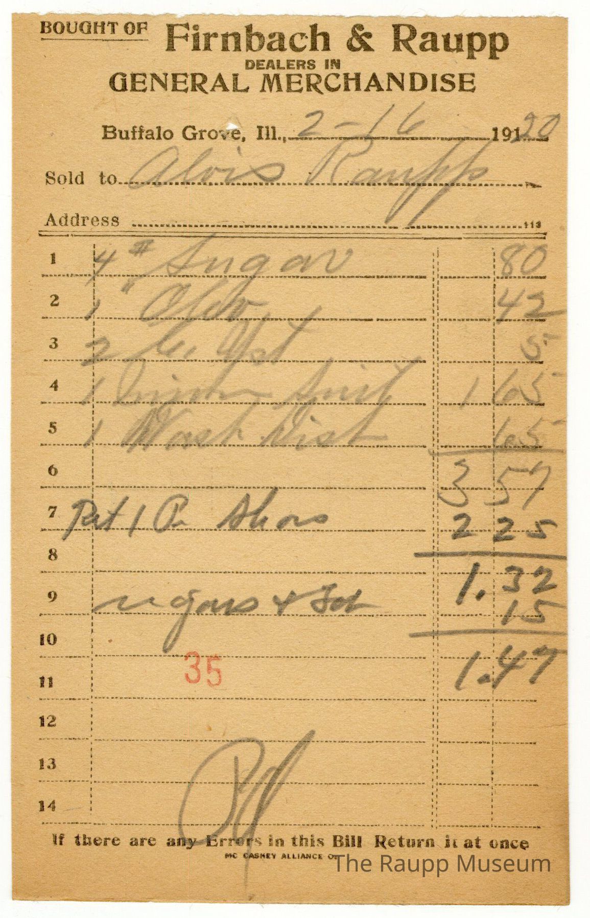 One (1) Firnbach and Raupp store receipt from February 16, 1920. Receipt is rectangular with black printed text and written notes in pencil. The receipt is for Alois Raupp who bought four pounds sugar for $.80, one Olob(?) for $0.42, 2 C. yeast for $0.05, one union suit for $1.65, and one wash dish for $0.65. The bill total was $3.57. There is a second bill for $1.47.There is a red stamp of 35 close to the bottom, with the bill marked as paid. He also returned 1 pair of shoes for $2.25, and bought cigars and tobacco for $0.15.
