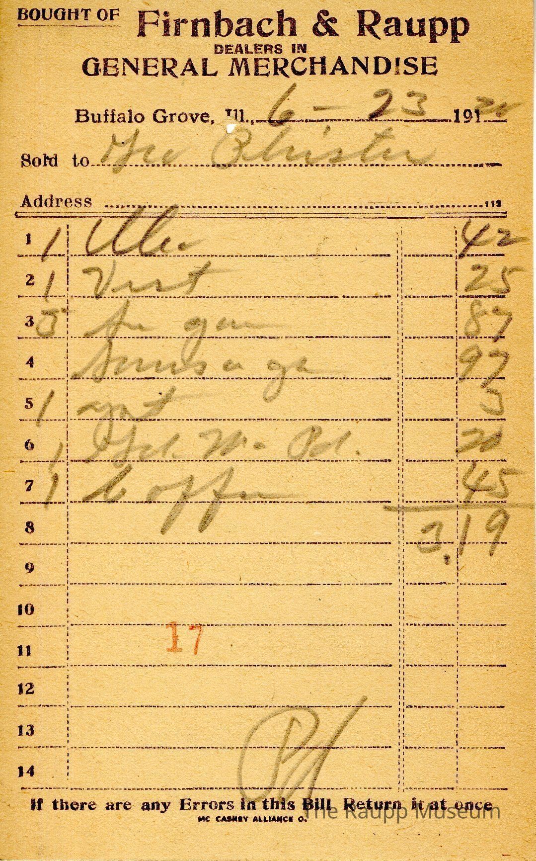 The black text is as follows, from top to bottom bought of Firnback & Raupp; Dealers in General Merchandise; Buffalo Grove, Ill.; Sold to; Address; If there are any Errors in this Bill Return it at once; MC CASKEY ALLIANCE O.Archive Details