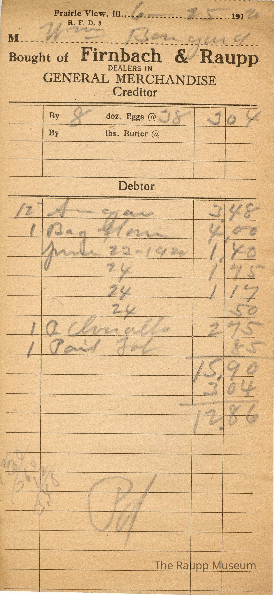 One (1) Firnbach and Raupp store receipt from June 25th, 1920. Receipt is rectangular with black printed text and written notes in pencil. The receipt is for William Bougard who sold 8 dozen eggs @ $0.38/dozen for $3.04. He bought 1 sugar for $3.48, 1 bag of flour for $4.00, 4 tabs from June 23rd-24th for $4.82, 1 pair overalls for $2.75, 1 pail of tobacco for $0.85 for a total of $15.90 with a $3.04 credit for a final bil of $12.86. The bill marked as paid near the bottom. There is some addition written on the bottom left of the receipt.