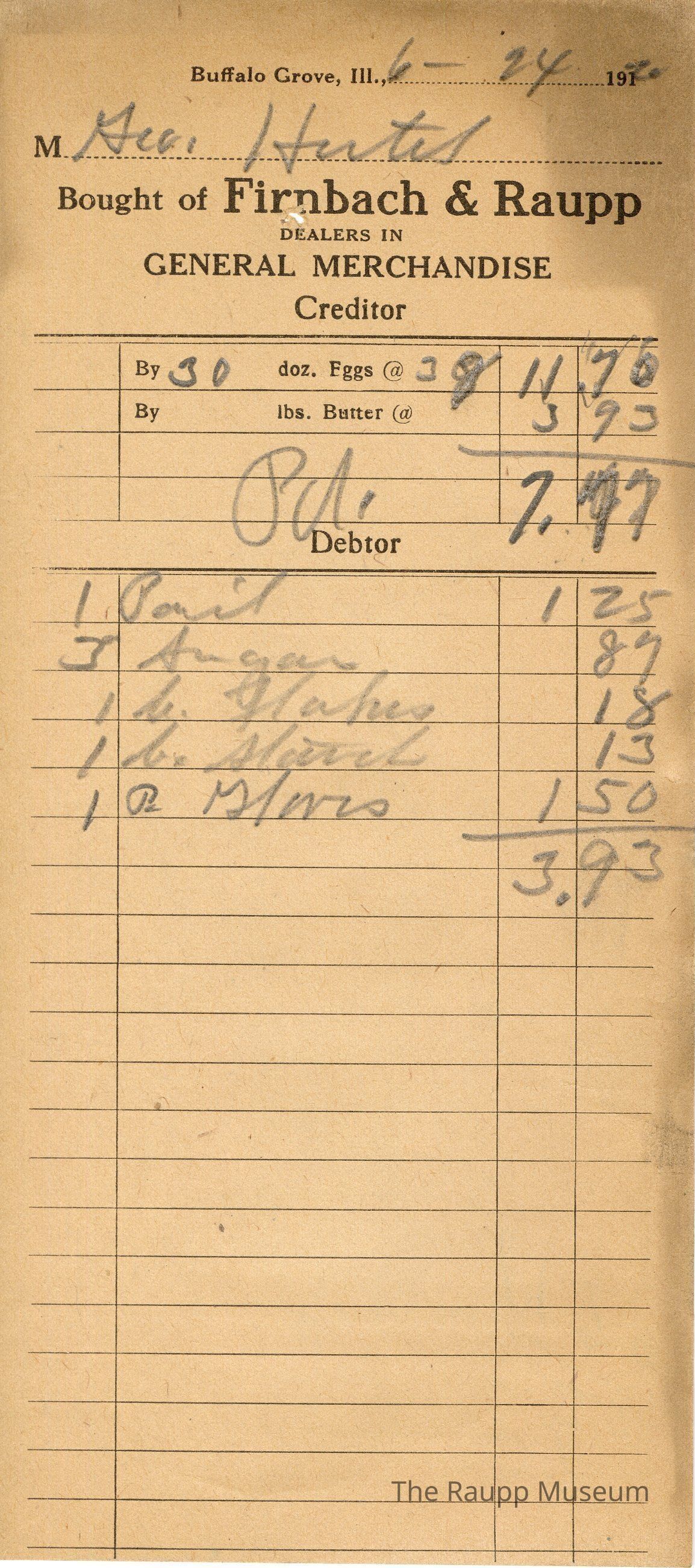 One (1) Firnbach and Raupp store receipt from June 24th, 1920. Receipt is rectangular with black printed text and written notes in pencil. The receipt is for George Hertel who sold 30 dozen eggs @ $0.38/dozen for $11.70. She bought 1 pain for $1.25, 3 sugars for $0.89, 1 cup flakes? for $0.18, 1 cup starch? for $0.13 and 1 pair gloves for $1.50 for a total of $3.93. $3.93 was subtracted from the store credit of $11.70 for a total of $7.75. The bill marked as paid at the bottom of the creditor section.