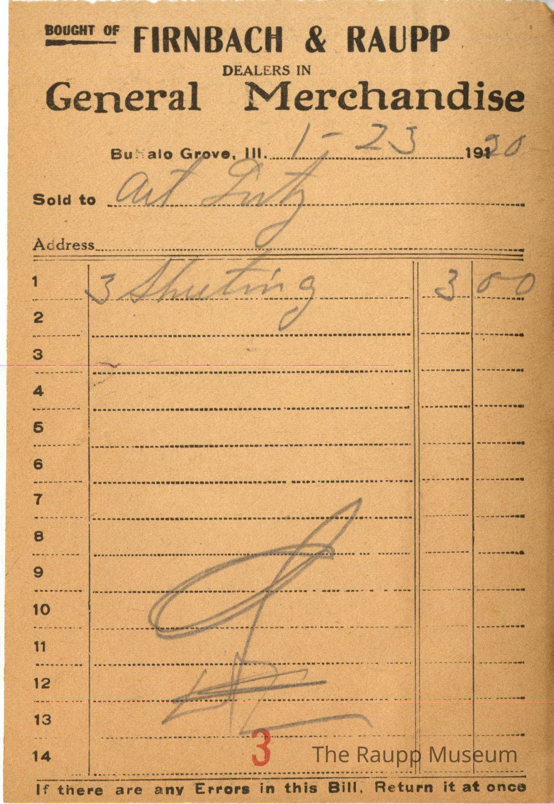 One (1) Firnbach and Raupp store receipt from January 23, 1920. Receipt is rectangular with black printed text and handwritten notes in pencil. The receipt is for Art Lutz who only purchased three sheeting for $3.00. The bill is marked as paid and on the fourteenth line there is a red stamped 3.