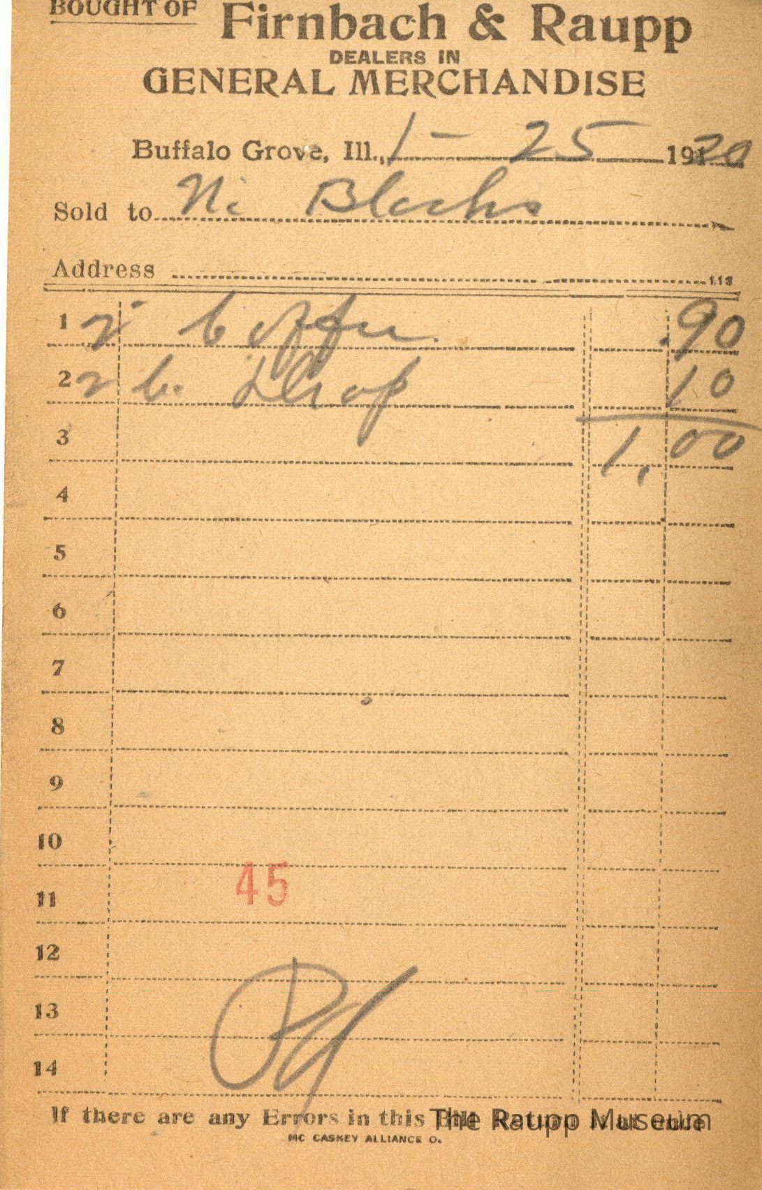One (1) Firnbach and Raupp store receipt from January 24, 1920. Receipt is rectangular with black printed text and handwritten notes in pencil. The receipt is for N. Blocks who bought two pounds of coffee for $0.90 and two orders of syrup for $0.10. The bill total comes out to $1.00. On the eleventh line there is a red stamped 45 and beneath the bill is marked as paid.
