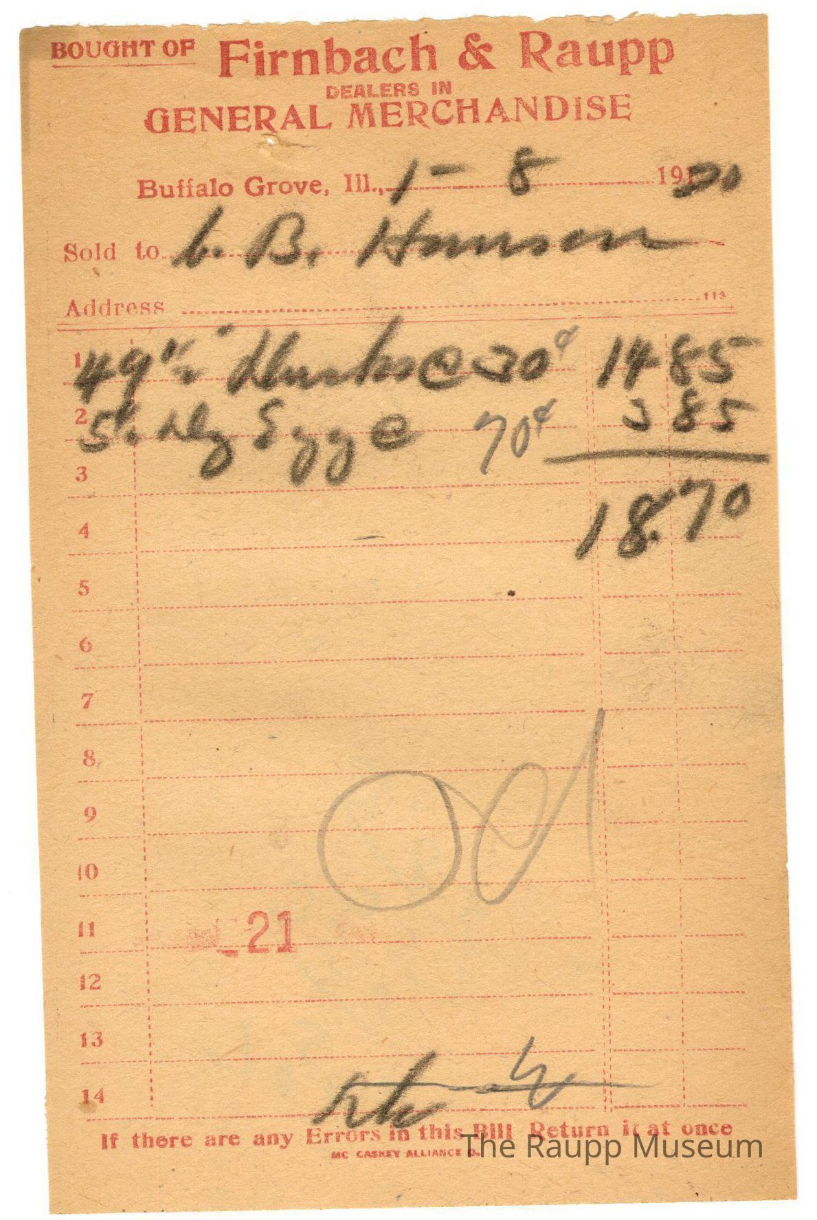 The black text is as follows, from top to bottom: "Bought of Firnbach and Raupp; Dealers in GENERAL MERCHANDISE; Buffalo Grove, Ill.; Sold to; Address; if there are any Errors in this Bill Return it at once; MC CASKEY ALLIANCE O."Archive Details