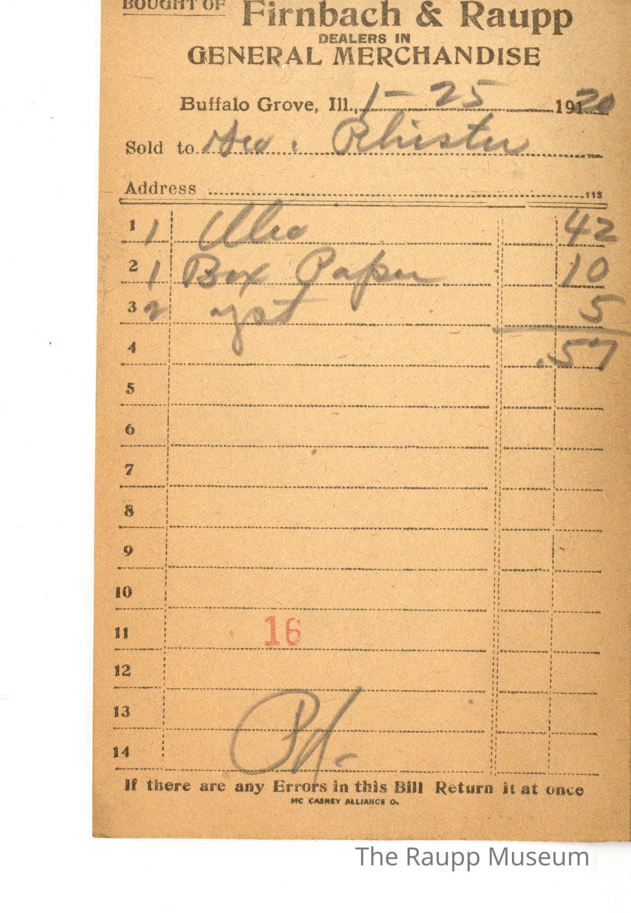 The black text is as follows, from top to bottom: "Bought of Firnbach and Raupp dealers in GENERAL MERCHANDISE" Buffalo Grove Ill.; Sold to; address; if there are any Errors in this Bill Return it at once; MC CASKEY ALLIANCE O."Archive Details