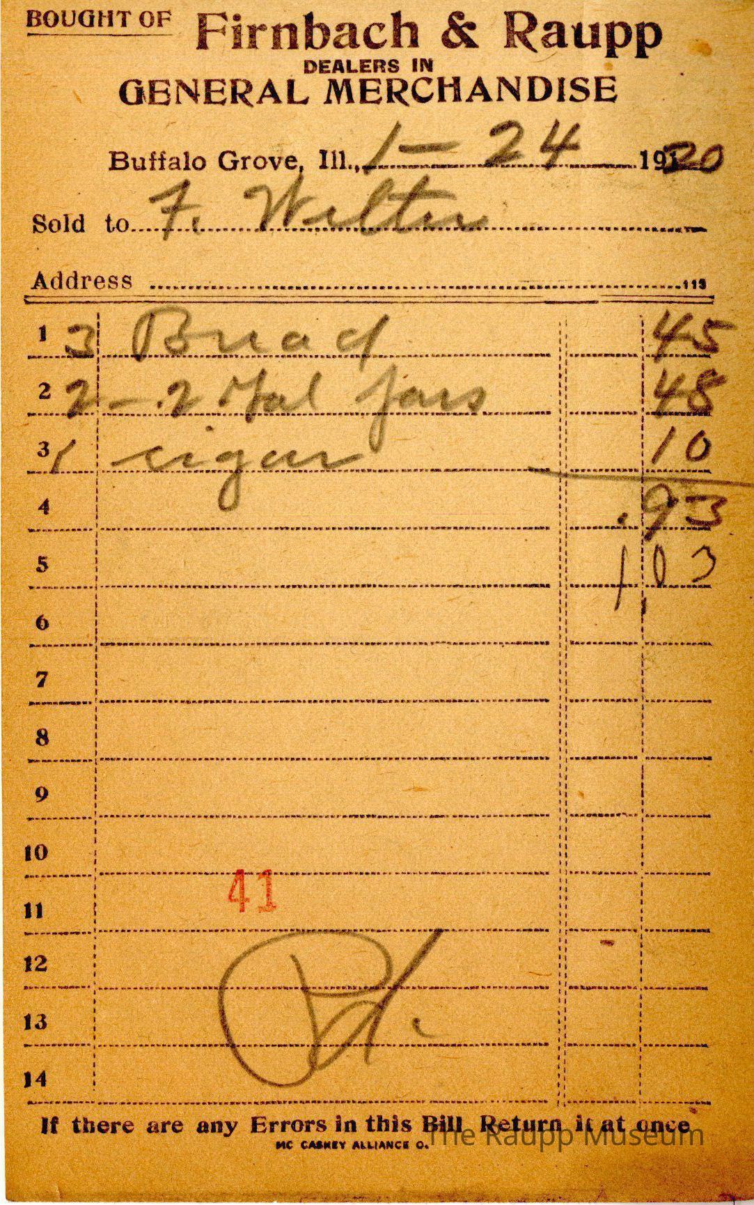 One (1) Firnbach and Raupp store receipt from January 24, 1920. Receipt is rectangular with black printed text and handwritten notes in pencil. The receipt is for Y. Walter who purchased three bread for $0.45, two 2-gallon jars for $0.48, and one cigar for $0.10. The bill total is marked as $0.93, before being recalculated to $1.03. On the eleventh line there is a red stamped 41 and below it the bill is marked as paid.