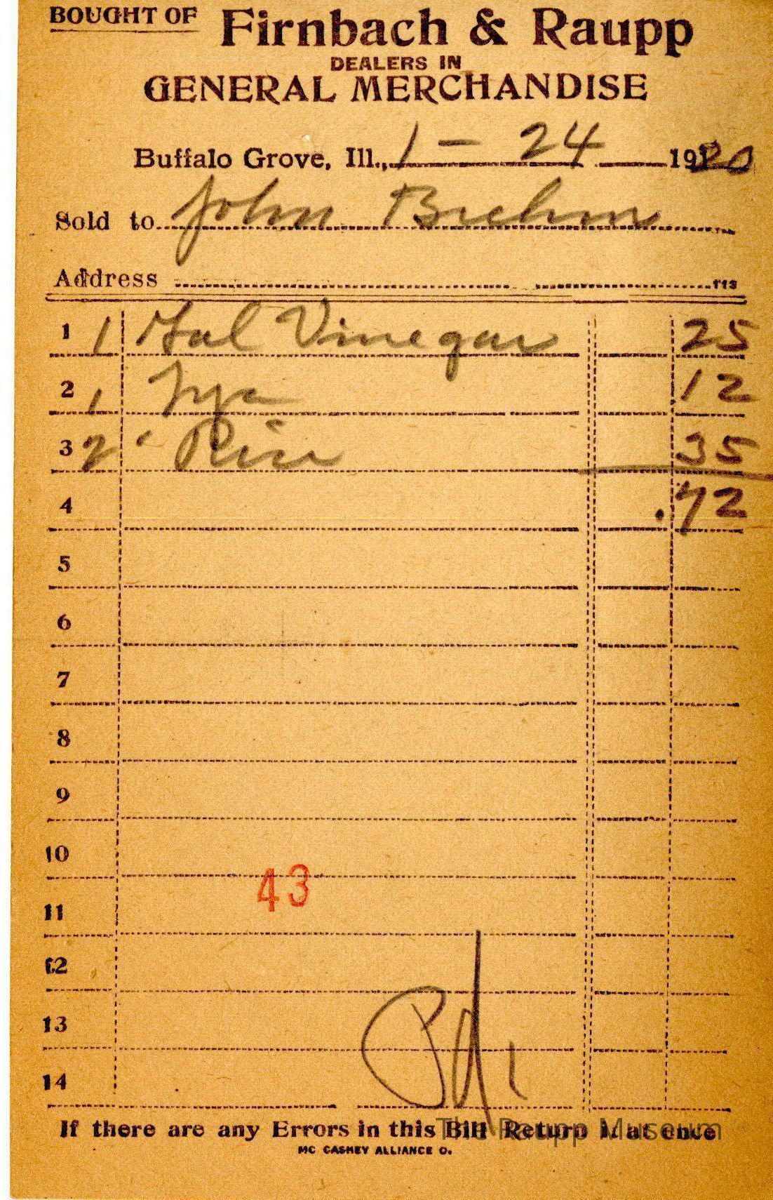 One (1) Firnbach and Raupp store receipt from January 24, 1920. Receipt is rectangular with black printed text and handwritten notes in pencil. The receipt is for John Brehm who purchased one gallon of vinegar for $0.25, one lye for $0.35, and two pounds of rice for $0.35. The bill total comes out to $0.72. On the eleventh line there is a red stamped 43 and below it the bill is marked as paid.