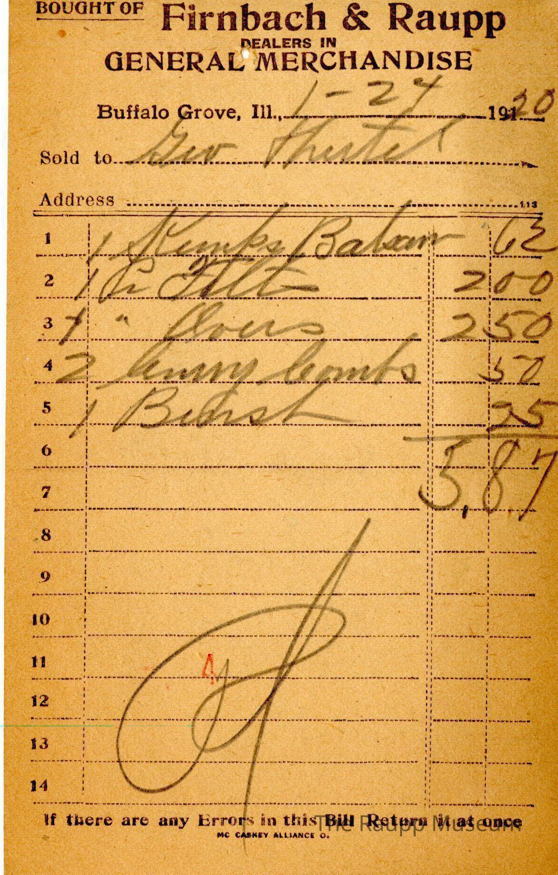 The black text is as follows, from top to bottom: "Bought of Firnbach and Raupp dealers in GENERAL MERCHANDISE" Buffalo Grove Ill.; Sold to; address; if there are any Errors in this Bill Return it at once; MC CASKEY ALLIANCE O."Archive Details