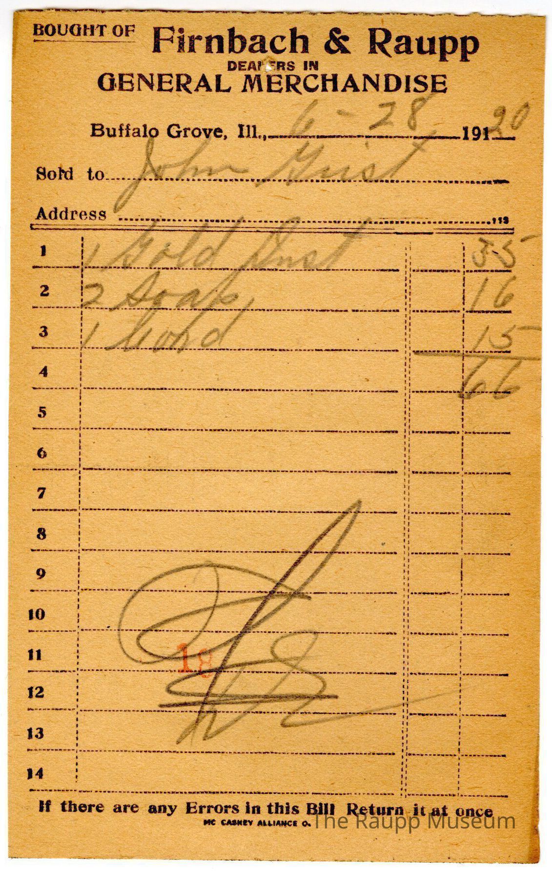 The black text is as follows, from top to bottom: "Bought of Firnbach and Raupp; Dealers in GENERAL MERCHANDISE; Buffalo Grove, Ill.; Sold to; Address; if there are any Errors in this Bill Return it at once; MC CASKEY ALIIANCE O."Archive Details