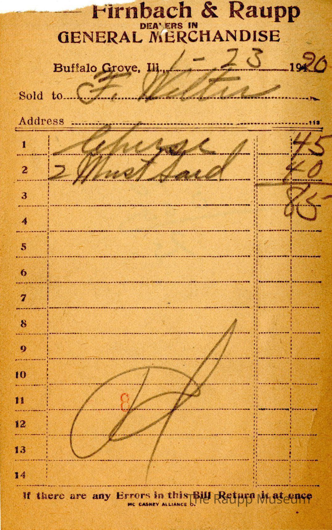 One (1) Firnbach and Raupp store receipt from January 23, 1920. Receipt is rectangular with black printed text and handwritten notes in pencil. The receipt is for F. Walter who purchased one cheese for $0.45, and two mustard seeds for $0.40. The bill total comes out to $0.85. On the eleventh line there is a red stamped 8 and below it the bill is marked as paid.