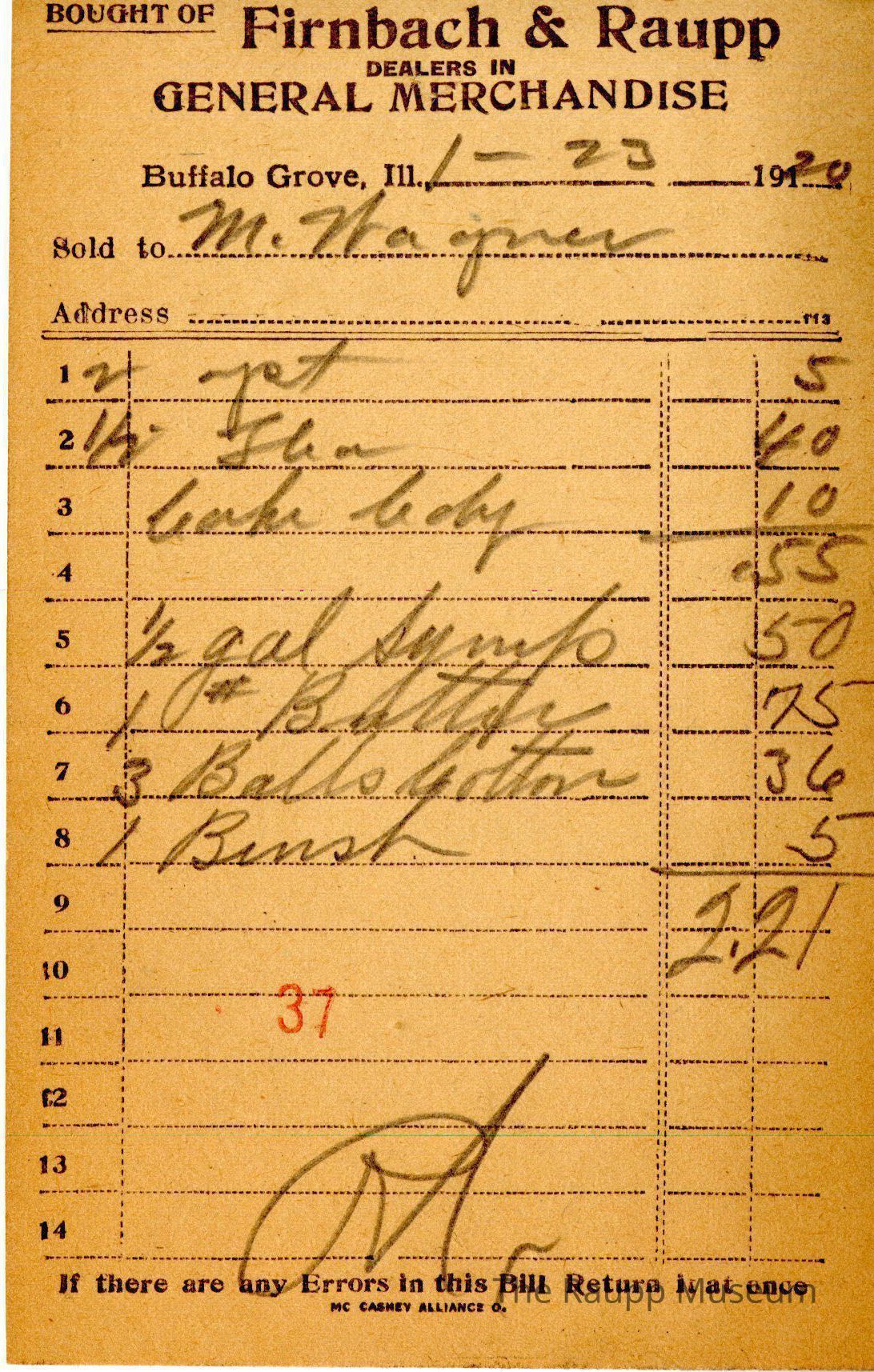 The black text is as follows, from top to bottom: "Bought of Firnbach and Raupp dealers in GENERAL MERCHANDISE" Buffalo Grove Ill.; Sold to; address; if there are any Errors in this Bill Return it at once; MC CASKEY ALLIANCE O."Archive Details