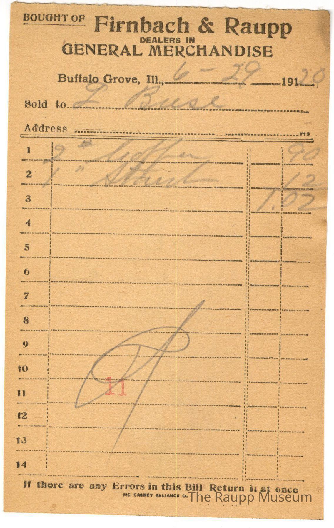 The black text is as follows, from top to bottom: Bought of Firnbach & Raupp, Dealers in GENERAL MERCHANDISE; Buffalo Grove Ill.; Sold to; Address; If there are any Errors in this Bill Return it at once; MC CASKEY ALLIANCE O.Archive Details