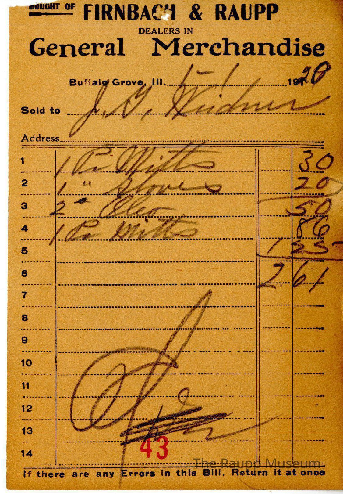 One (1) Firnbach and Raupp store receipt from January 1, 1920. Receipt is rectangular with black printed text and handwritten notes in pencil. The receipt is for J. G. Weidner who purchased one pair of mitts for $0.30, one pair of gloves for $0.20, two pounds of oleo for $0.50, and another pair of mitts for $0.86. On line five of the paper there is a price of $1.25. The bill total comes out to $2.61 somehow. On the fourteenth line there is a red stamped 43 and above the bill has been marked as paid at a later date.