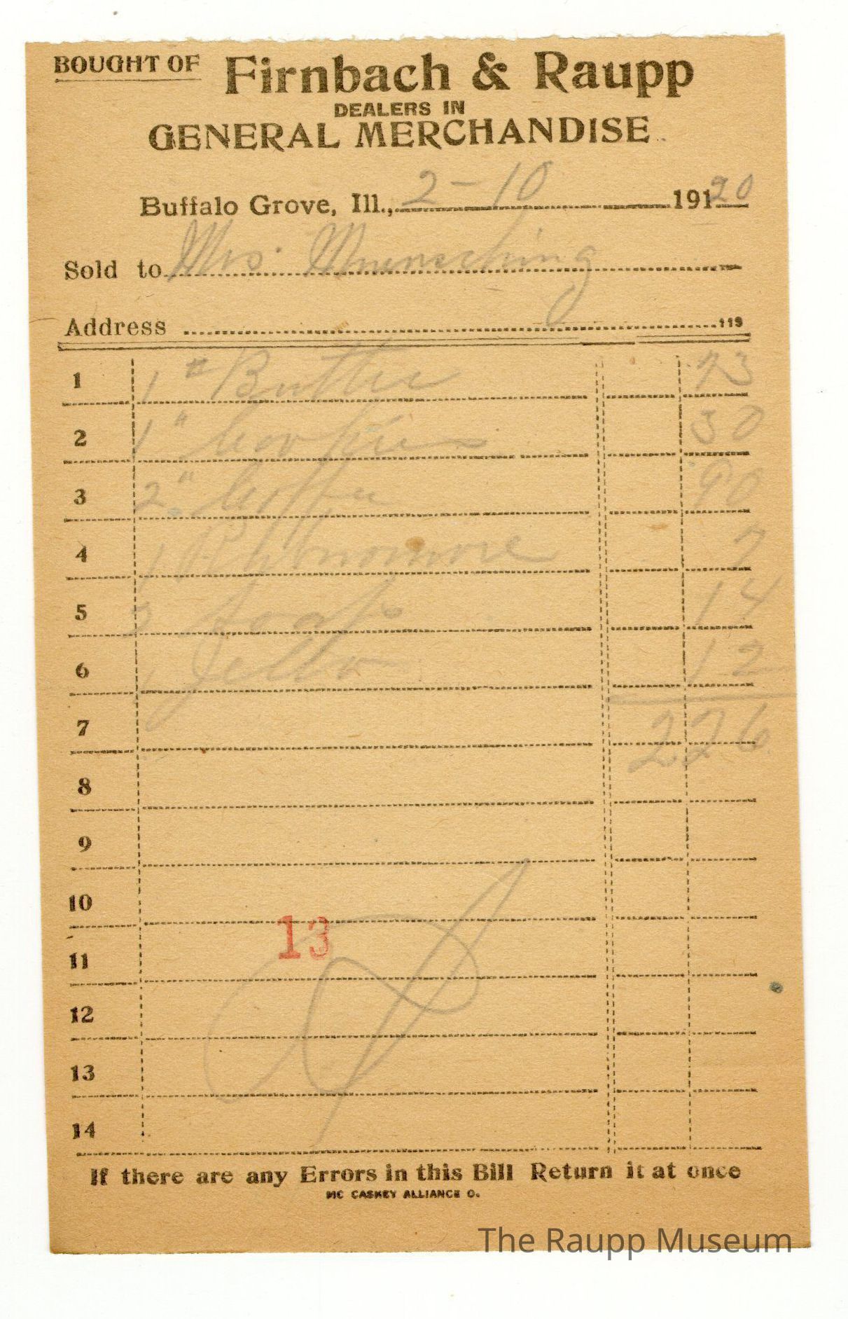 The black text is as follows, from top to bottom: "Bought of Firnbach and Raupp; Dealers in GENERAL MERCHANDISE; Buffalo Grove, Ill.; Sold to; Address; if there are any Errors in this Bill Return it at once; MC CASKEY ALLIANCE O."Archive Details