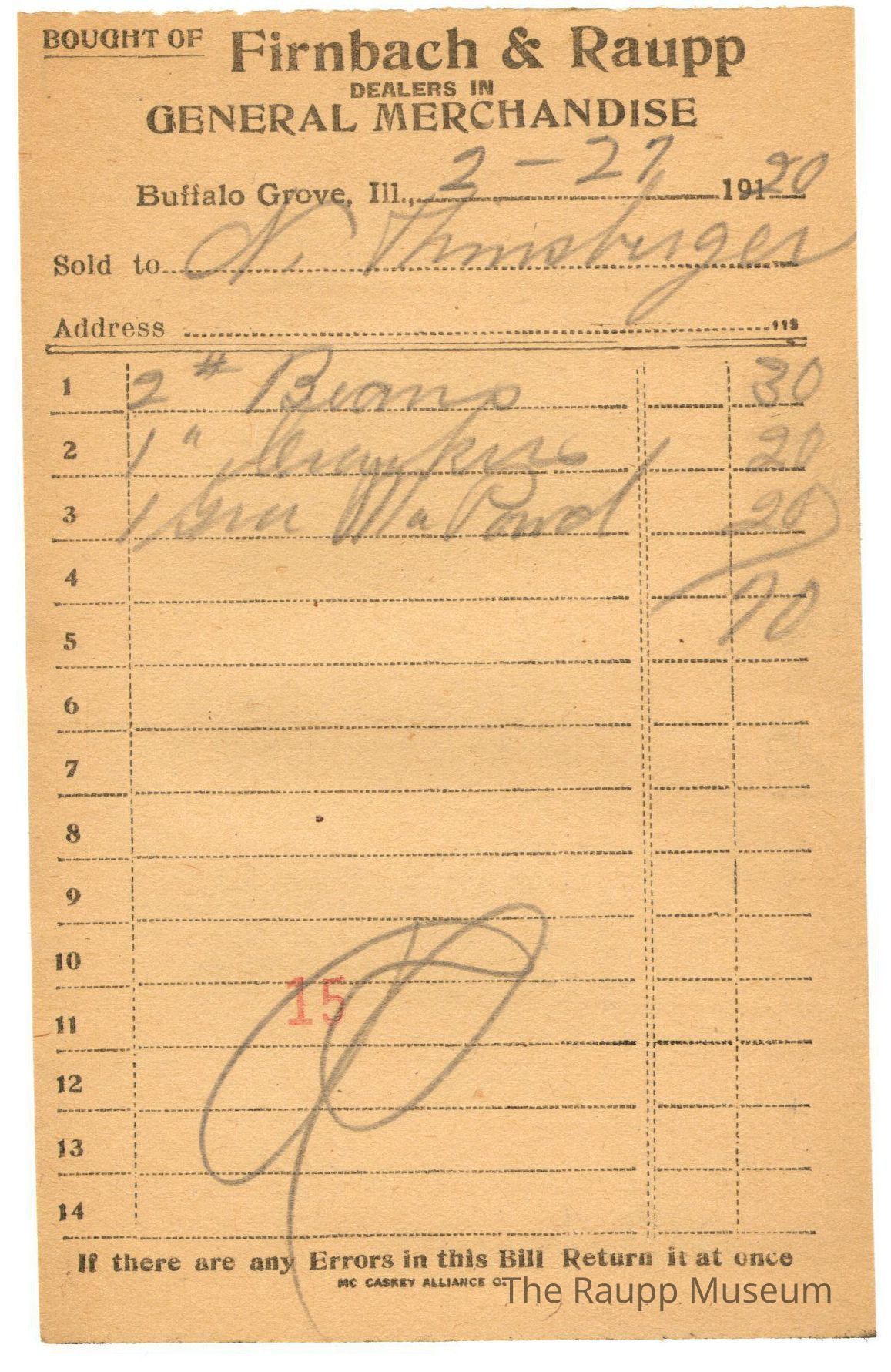 One (1) Firnbach and Raupp store receipt from February 27, 1920. Receipt is rectangular with black printed text and written notes in pencil. The receipt is for N. Hinsenberger, who bought two pounds beans for $0.30, one pound crackers for $0.20, and one Gra. Ma Powder for $0.20.The bill total was $1.11. There is a red stamp of 15 close to the bottom, with the bill marked as paid.