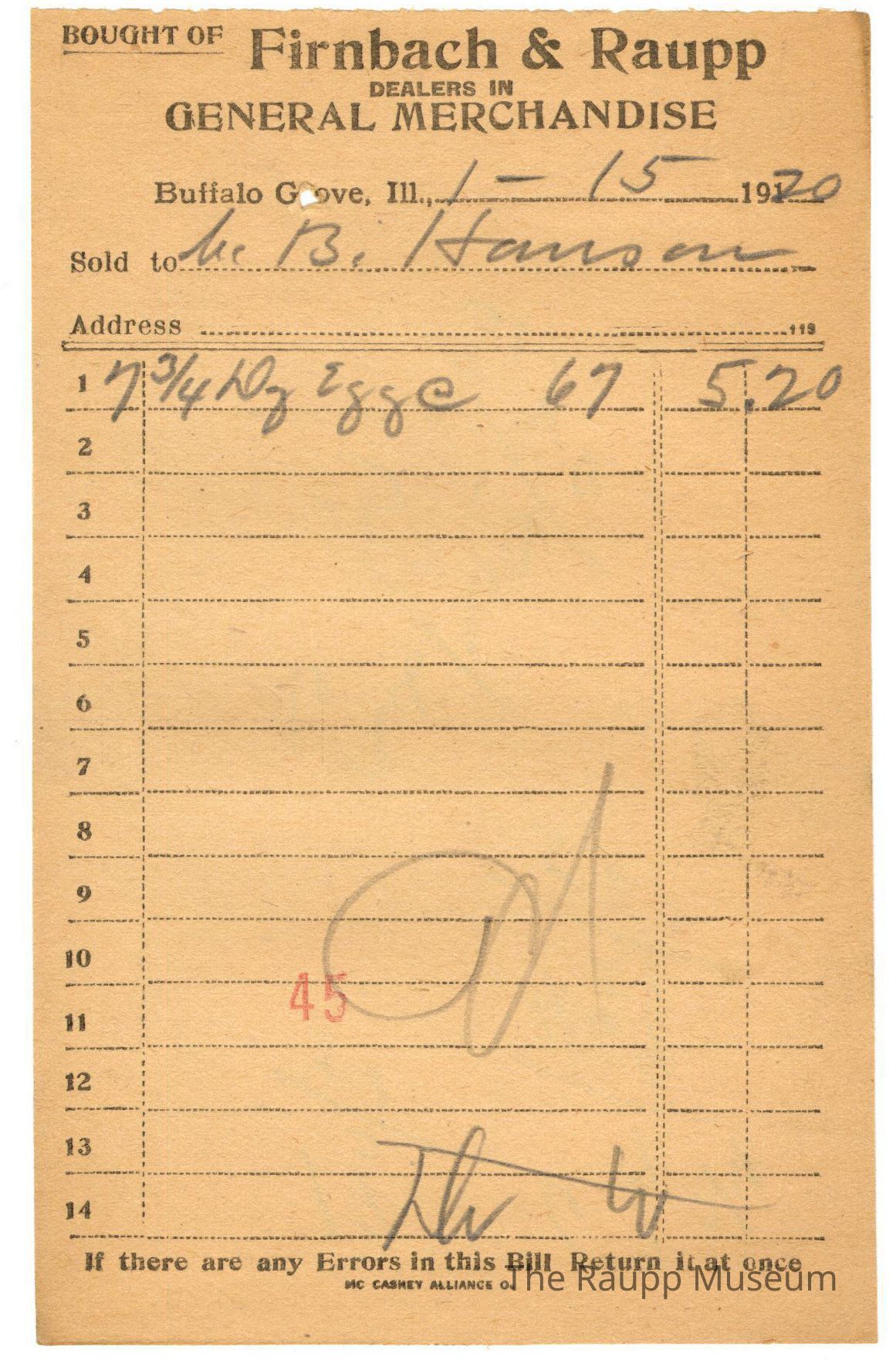 One (1) Firnbach and Raupp store receipt from January 15, 1920. Receipt is rectangular with black printed text and written notes in pencil. The receipt is for C. B. Hanson, who bought seven and three-fourths dozen eggs at $0.67 each for $5.20.The bill total is $5.20. There is a red stamp of 45 close to the bottom, with the bill marked as paid.