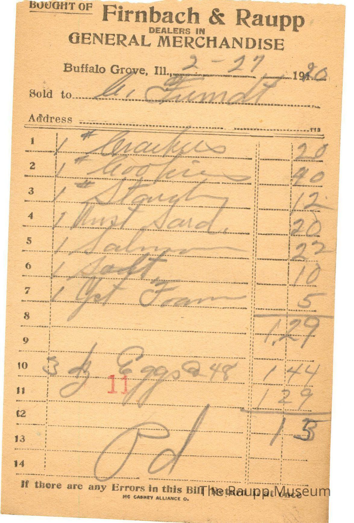 One (1) Firnbach and Raupp store receipt from February 27, 1920. Receipt is rectangular with black printed text and written notes in pencil. The receipt is for C.Fundt(?), who bought one pound crackers for $0.20, one pound cookies for $0.40, one pound starch for $0.12, one must. sand (?) for $0.20, one salmon for $0.22, one salt for $0.10, one yeast foam for $0.05, and three dozen eggs for $1.44. The bill total is $1.42. There is a red stamp of 11 close to the bottom, with the bill marked as paid.