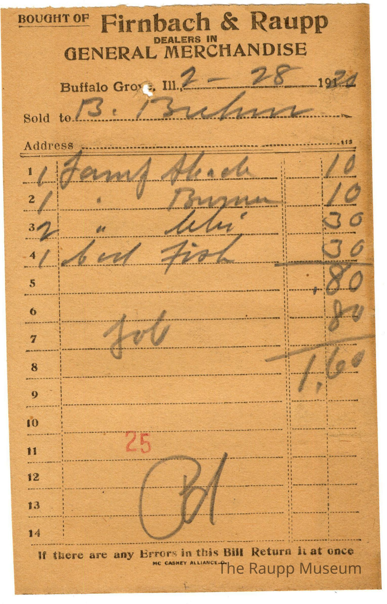 The black text is as follows, from top to bottom: "Bought of Firnbach and Raupp; Dealers in GENERAL MERCHANDISE; Buffalo Grove, Ill.; Sold to; Address; if there are any Errors in this Bill Return it at once; MC CASKEY ALLIANCE O."Archive Details