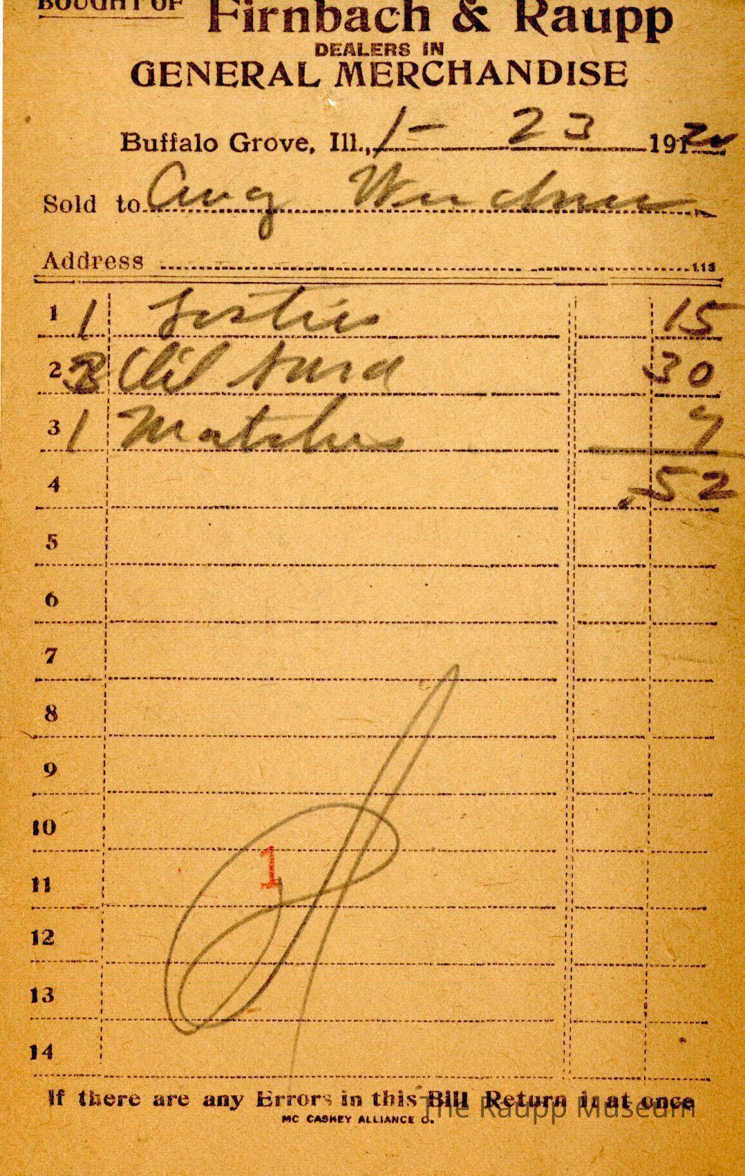 The black text is as follows, from top to bottom: "Bought of Firnbach and Raupp dealers in GENERAL MERCHANDISE" Buffalo Grove Ill.; Sold to; address; if there are any Errors in this Bill Return it at once; MC CASKEY ALLIANCE O."Archive Details