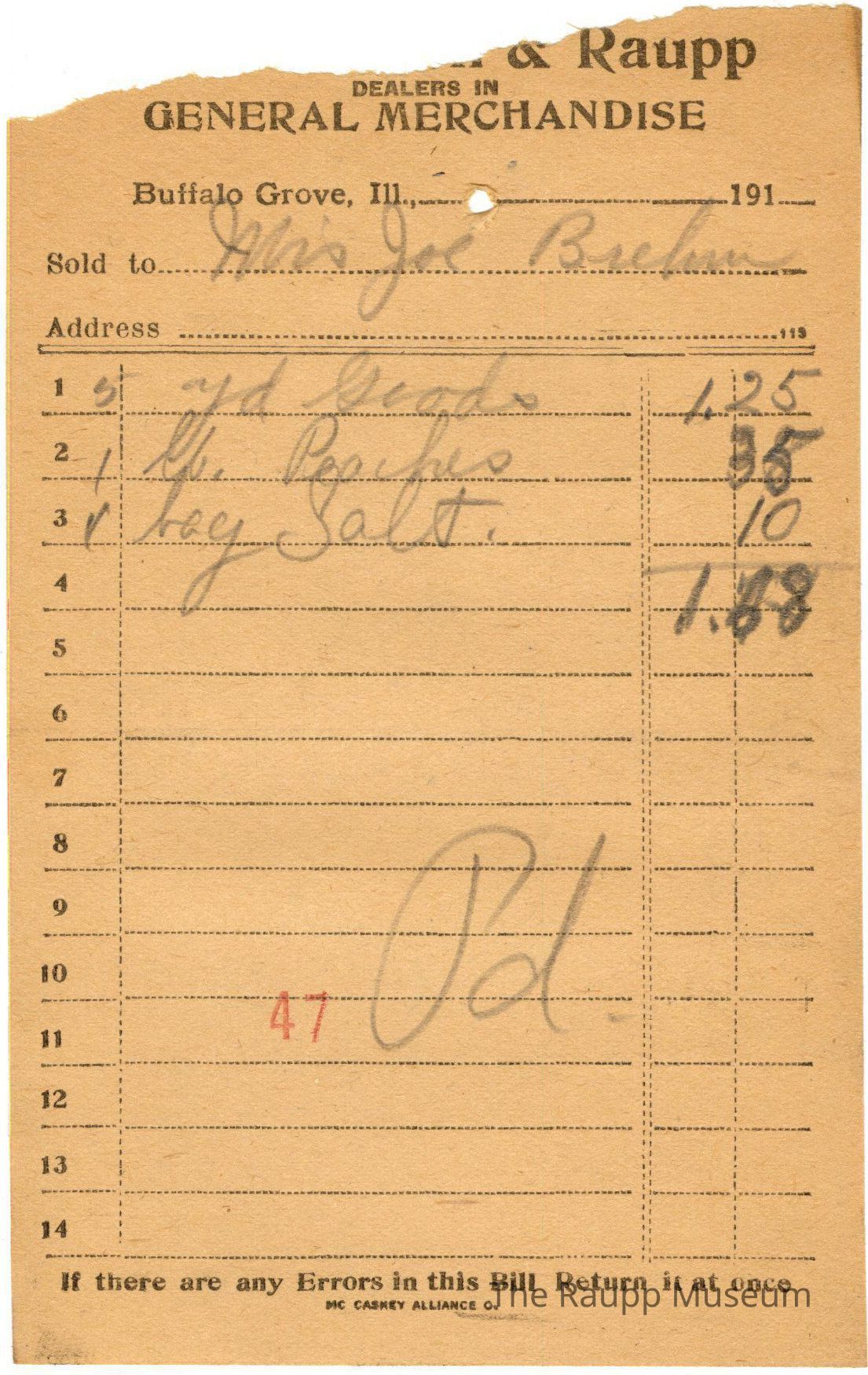 The black text is as follows, from top to bottom: "Bought of Firnbach and Raupp; Dealers in GENERAL MERCHANDISE; Buffalo Grove, Ill.; Sold to; Address; if there are any Errors in this Bill Return it at once; MC CASKEY ALLIANCE O."Dimensions