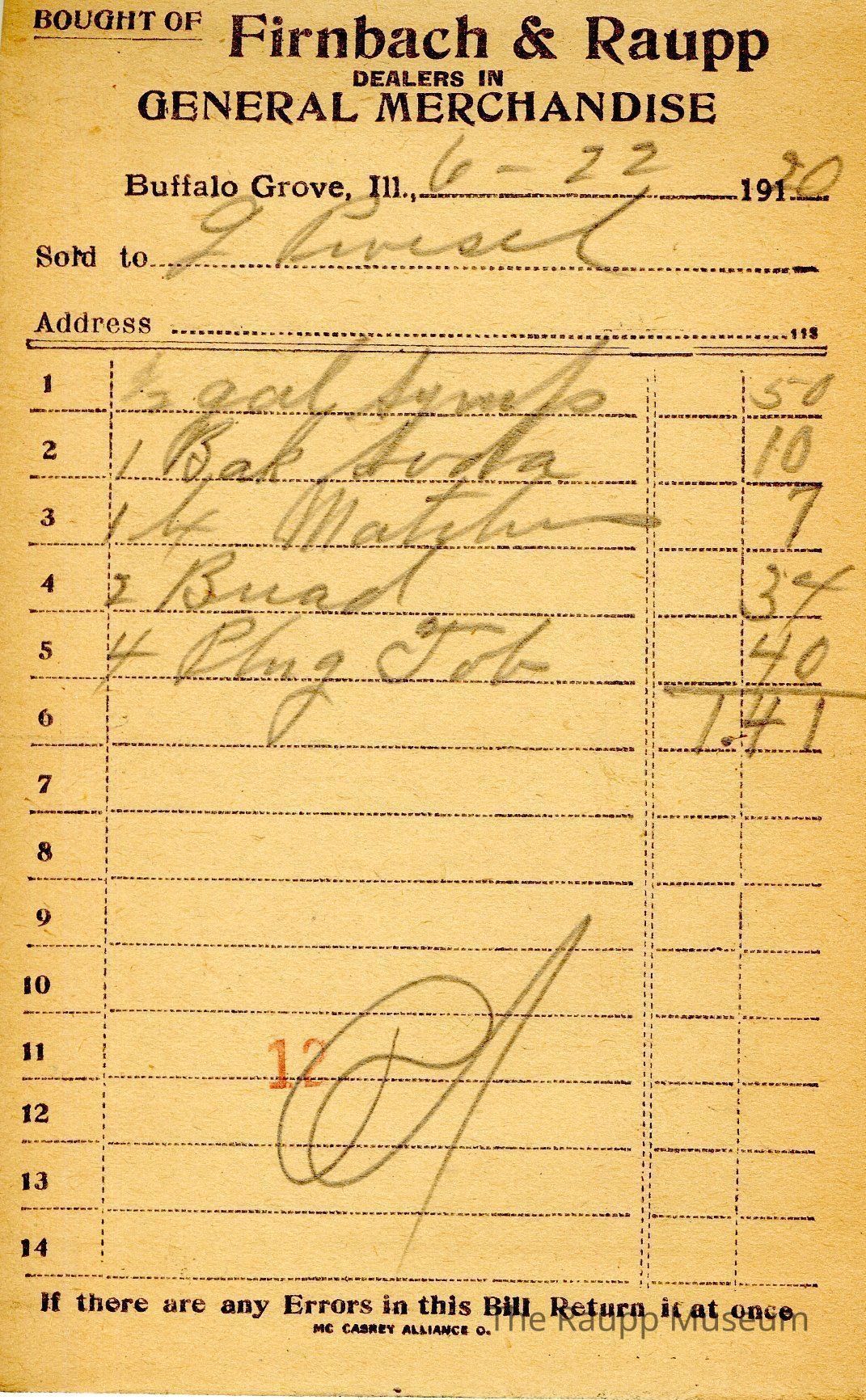 The black text is as follows, from top to bottom bought of Firnback & Raupp; Dealers in General Merchandise; Buffalo Grove, Ill.; Sold to; Address; If there are any Errors in this Bill Return it at once; MC CASKEY ALLIANCE O.Archive Details