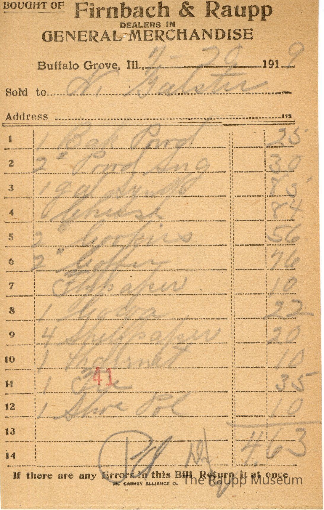 The black text is as follows, from top to bottom bought of Firnback & Raupp; Dealers in General Merchandise; Buffalo Grove, Ill.; Sold to; Address; If there are any Errors in this Bill Return it at once; MC CASKEY ALLIANCE O.Archive Details