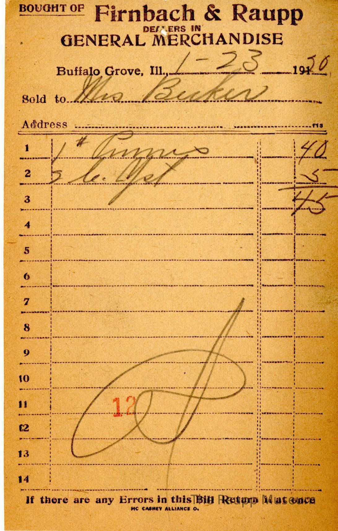 The black text is as follows, from top to bottom: "Bought of Firnbach and Raupp dealers in GENERAL MERCHANDISE" Buffalo Grove Ill.; Sold to; address; if there are any Errors in this Bill Return it at once; MC CASKEY ALLIANCE O."Archive Details