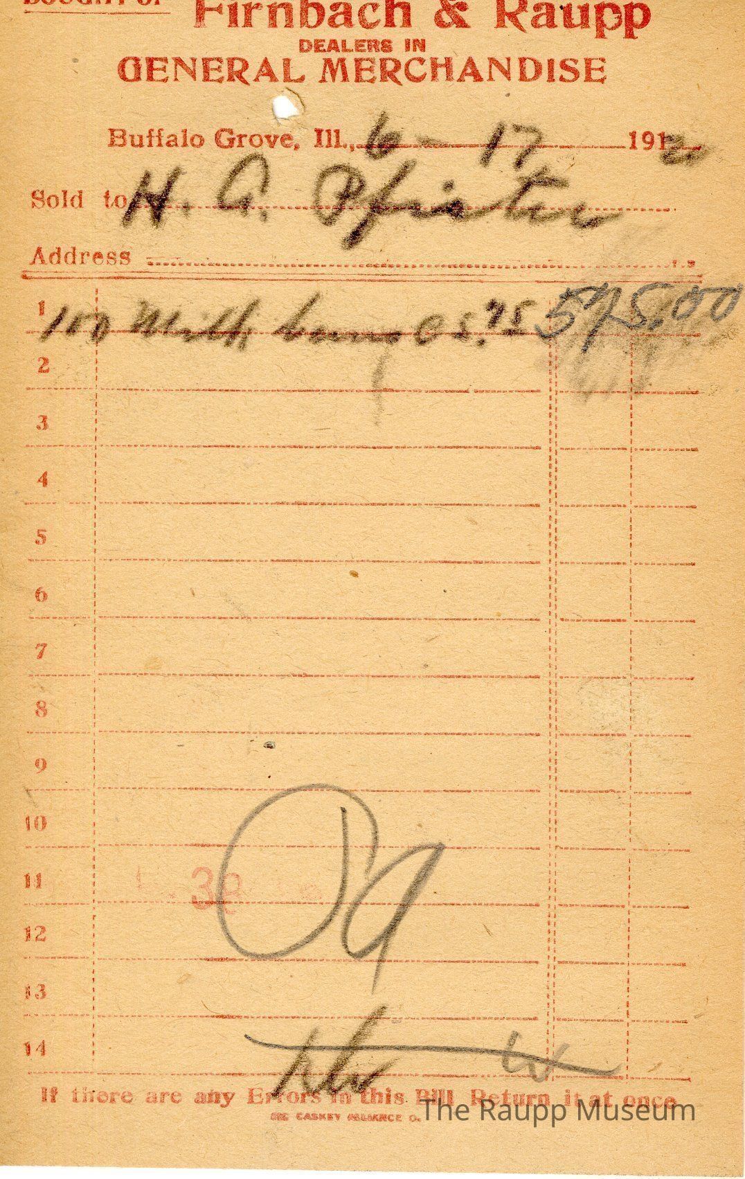 The red text is as follows, from top to bottom bought of Firnback & Raupp; Dealers in General Merchandise; Buffalo Grove, Ill.; Sold to; Address; If there are any Errors in this Bill Return it at once; MC CASKEY ALLIANCE O.Archive Details