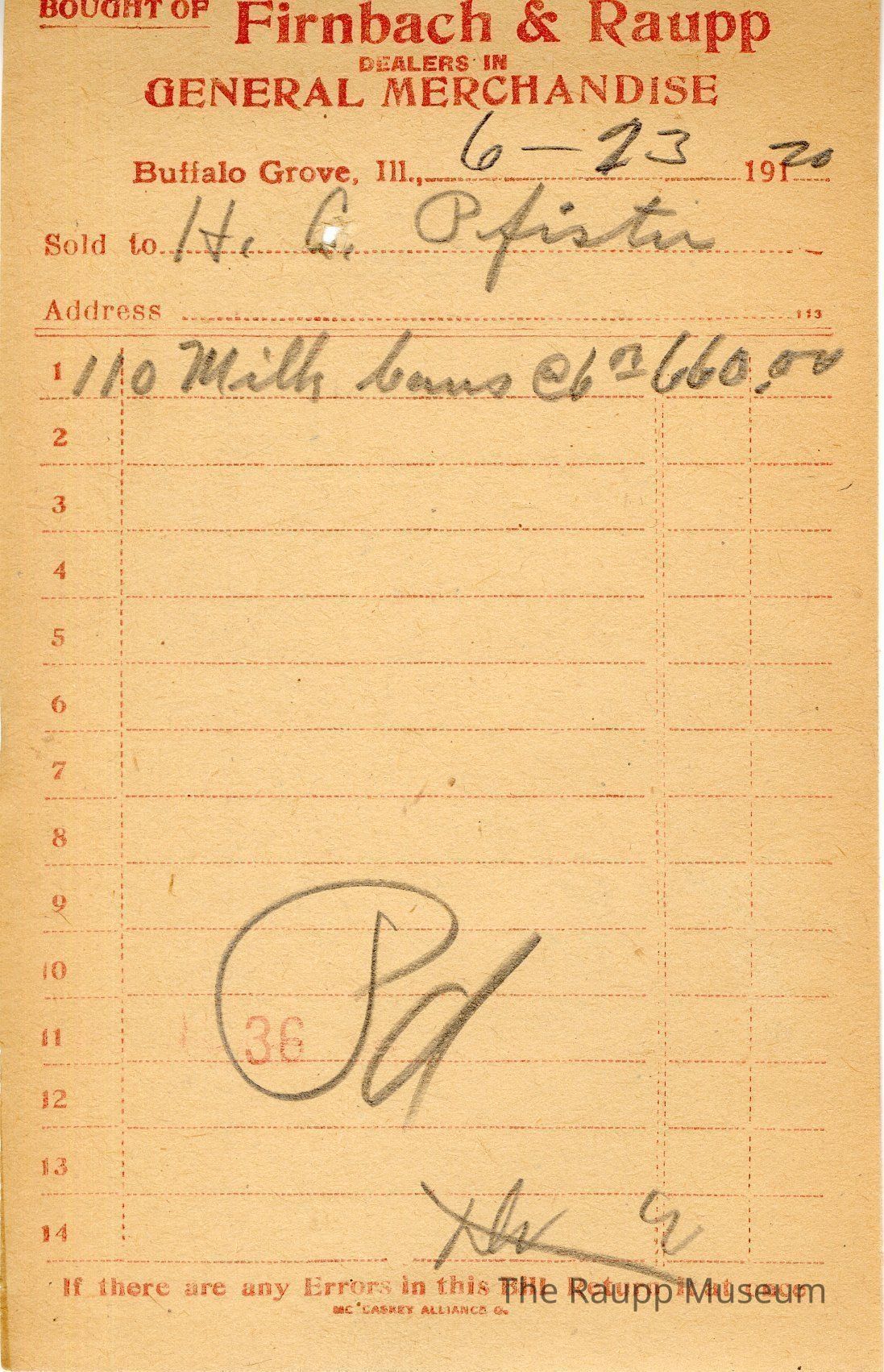 One (1) Firnbach and Raupp store receipt from June 23rd, 1920. Receipt is rectangular with red printed text and written notes in pencil. The receipt is for H.G. Pfister, who bought 110 milk cans at $6.03/pound? for a total of $660.00. There's a red stamp of 36 close to the bottom, with the bill marked as paid.