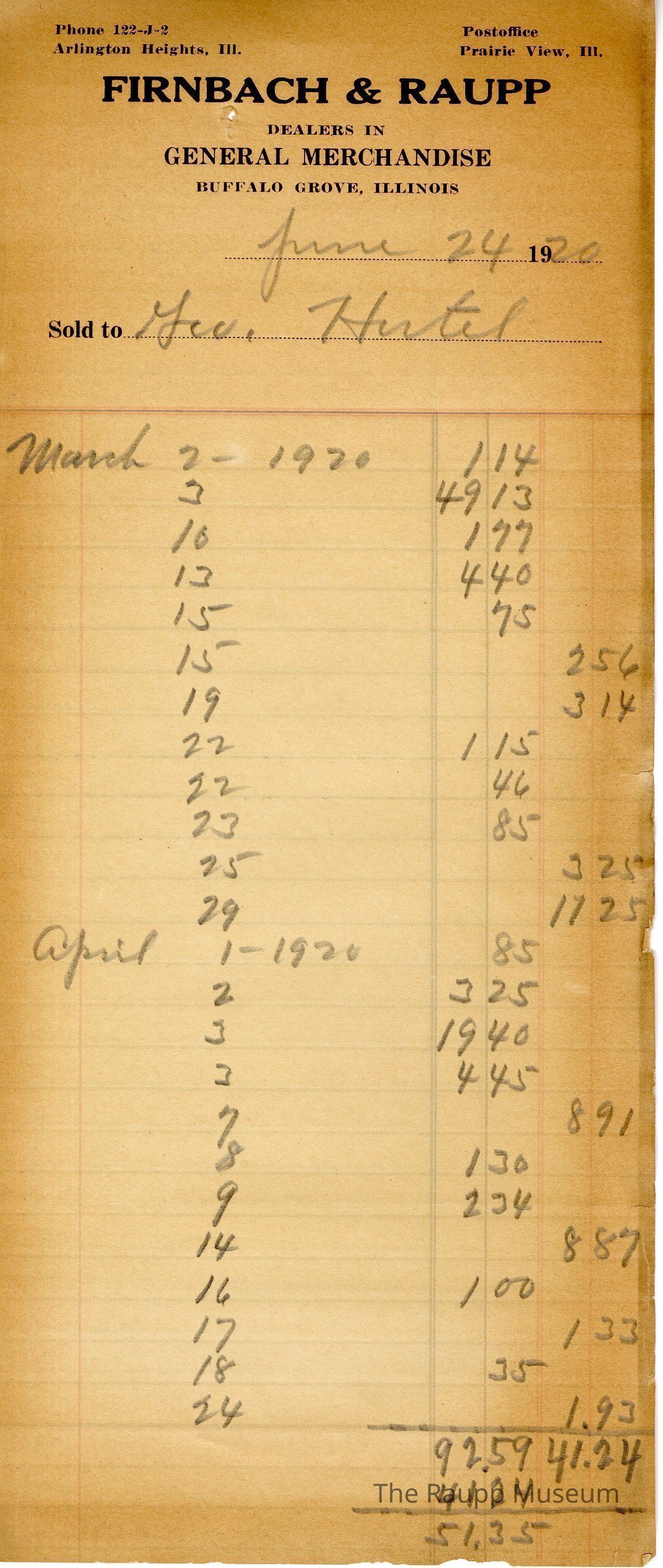 The black text is as follows, from top to bottom bought of Firnback & Raupp; Dealers in General Merchandise; Buffalo Grove, Ill.Archive Details