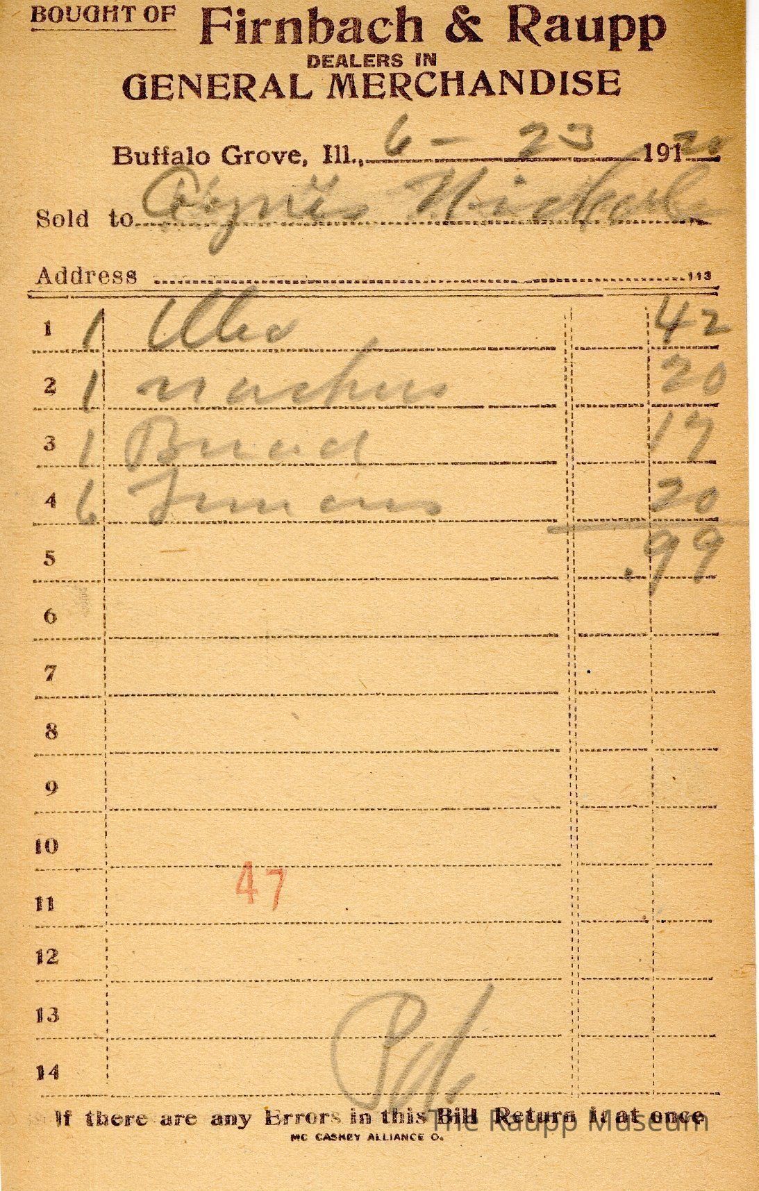 The black text is as follows, from top to bottom bought of Firnback & Raupp; Dealers in General Merchandise; Buffalo Grove, Ill.; Sold to; Address; If there are any Errors in this Bill Return it at once; MC CASKEY ALLIANCE O.Archive Details