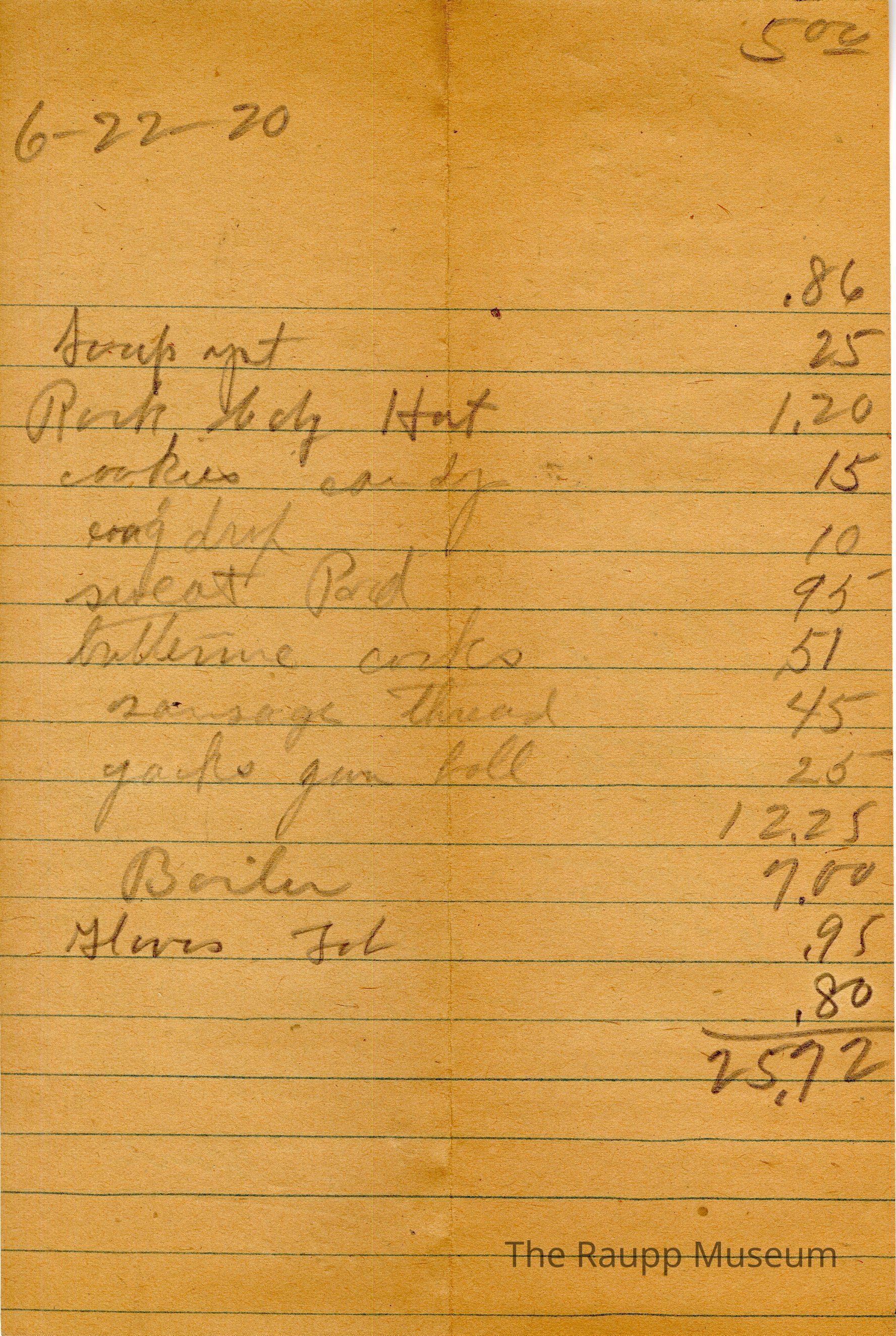 One receipt from June 22nd, 1920. Receipt is written on lined paper. It does not state who the receipt is for. The paper lists a series of items, some items combined on one line: soaps, yeast, rock candy, hat, cookies, candy, crag duf?, sweat pad, butterine? cakes, sausage thread, ? gum ball, boiler, gloves, tobacco for a total of $25.72. There is addition on the front and back of the paper.Archive Details