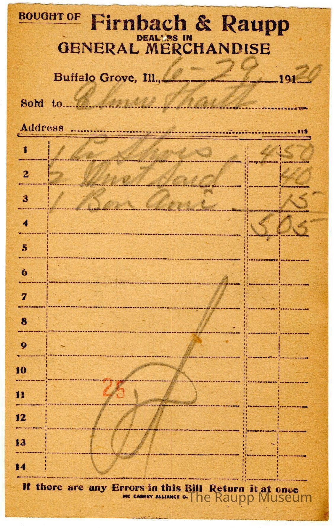 The black text is as follows, from top to bottom: "Bought of Firnbach and Raupp; Dealers in GENERAL MERCHANDISE; Buffalo Grove, Ill.; Sold to; Address; if there are any Errors in this Bill Return it at once; MC CASKEY ALIIANCE O."Archive Details