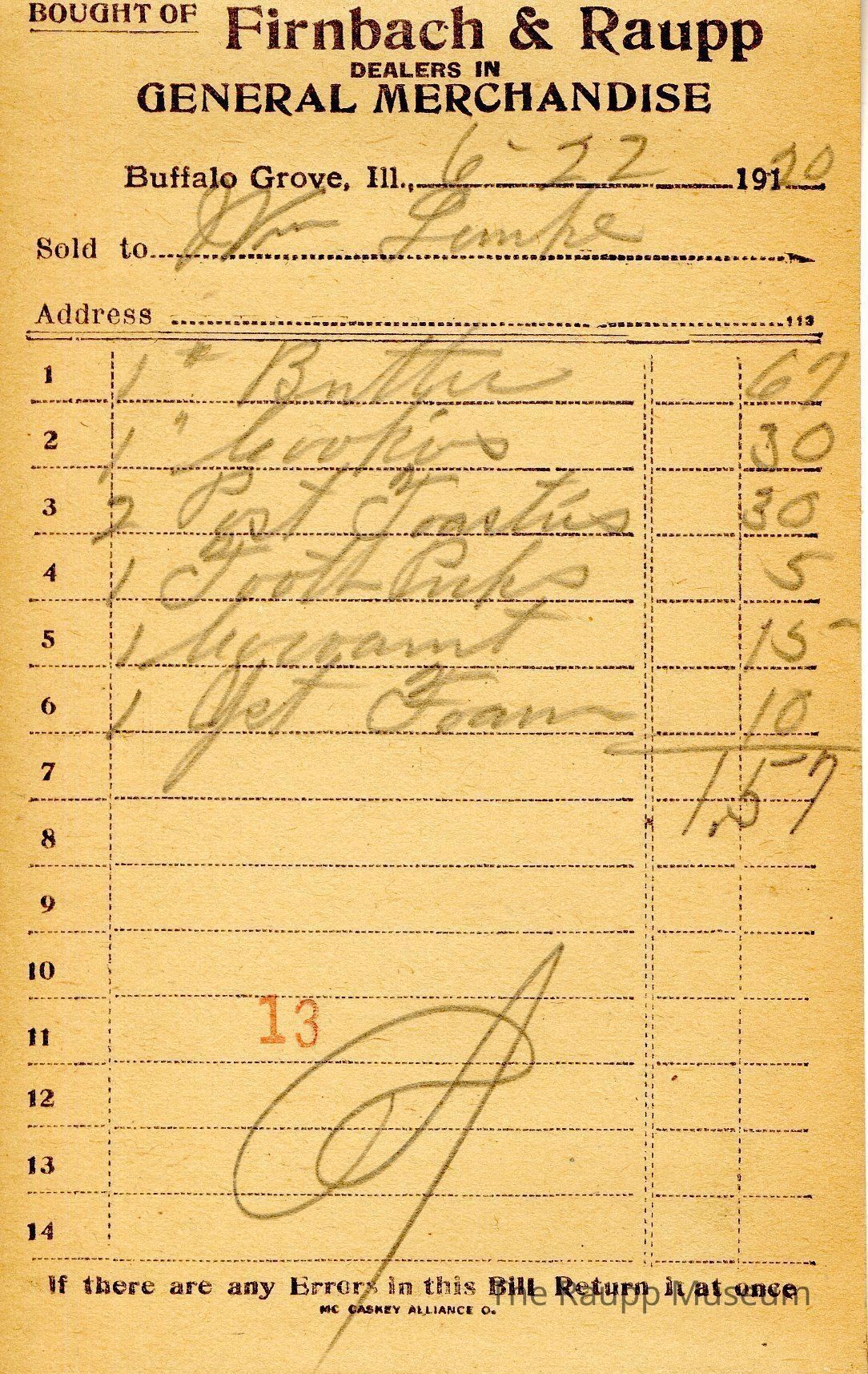 The black text is as follows, from top to bottom bought of Firnback & Raupp; Dealers in General Merchandise; Buffalo Grove, Ill.; Sold to; Address; If there are any Errors in this Bill Return it at once; MC CASKEY ALLIANCE O.Archive Details