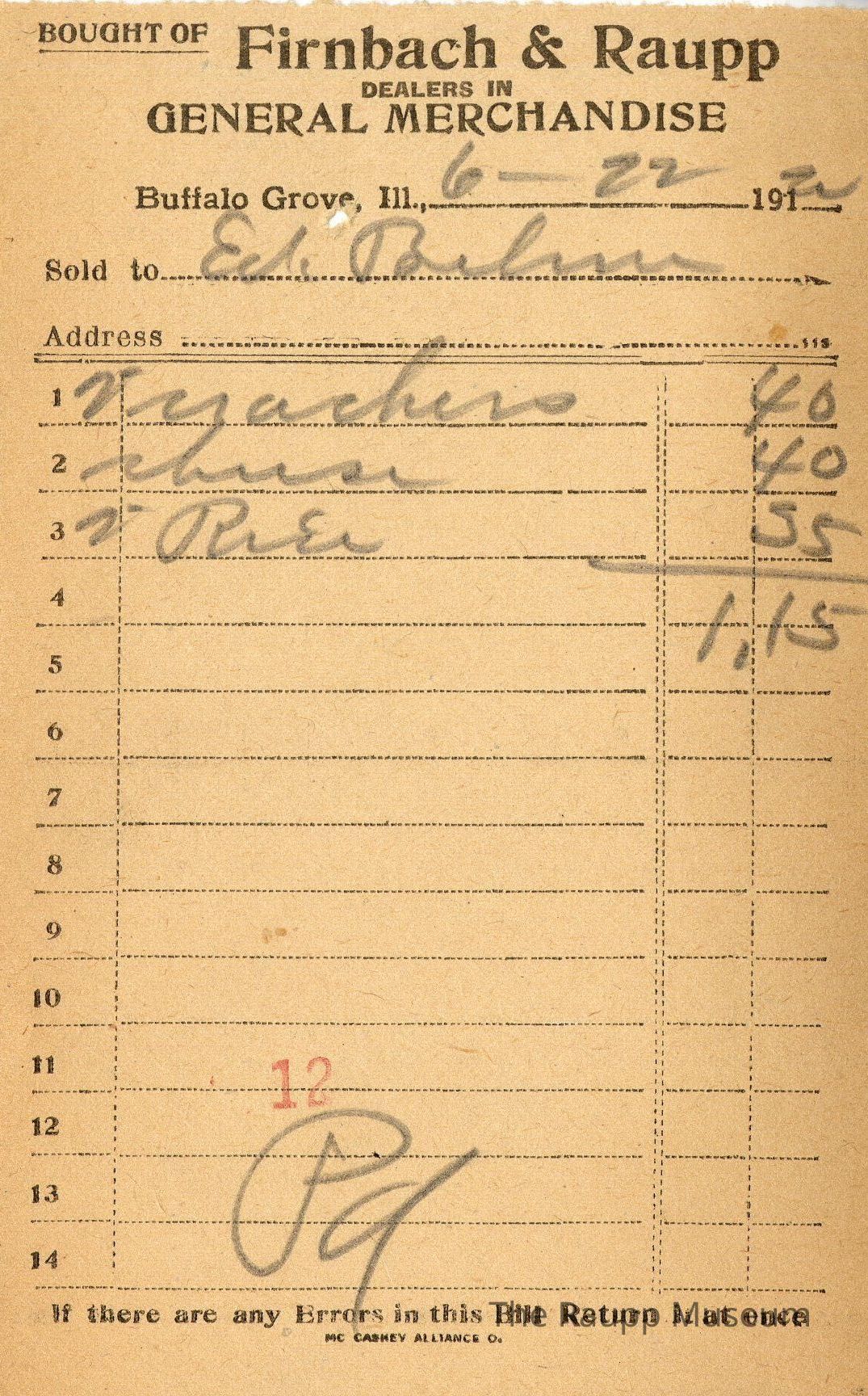 The black text is as follows, from top to bottom bought of Firnback & Raupp; Dealers in General Merchandise; Buffalo Grove, Ill.; Sold to; Address; If there are any Errors in this Bill Return it at once; MC CASKEY ALLIANCE O.Archive Details