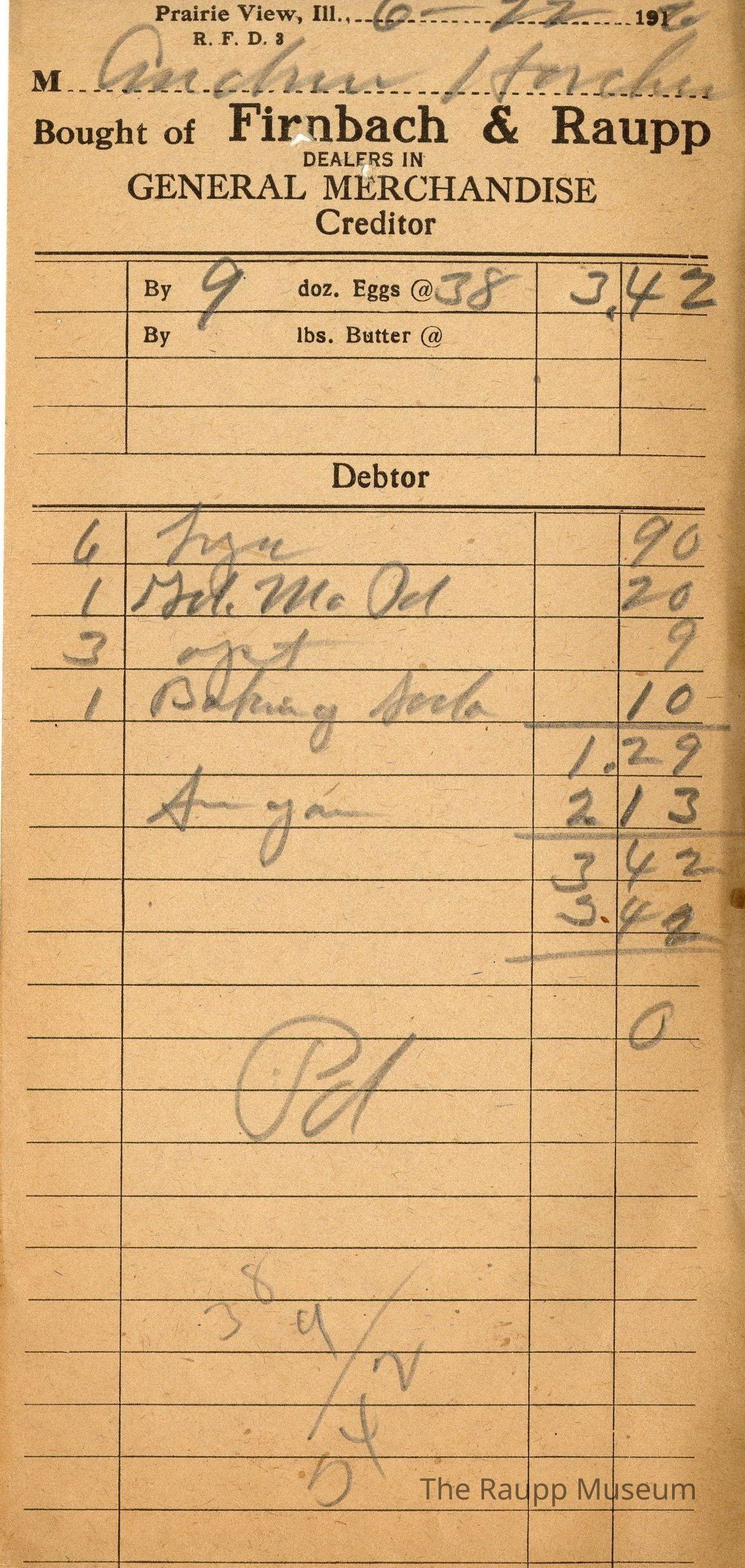 One (1) Firnbach and Raupp store receipt from June 22nd, 1920. Receipt is rectangular with black printed text and written notes in pencil. The receipt is for Andrew Horcher who sold 9 dozen eggs at $0.38/dozen for $3.42. He bought 6 lye for $0.90, 1 gal machine powder for $0.20, 3 yeast for $0.09, 1 baking soda for $0.10 and sugar for $2.13 for a total of $3.42. The $3.42 the customer received from the eggs was subtracted from the bill total for a final total of $0. The bill marked as paid in pencil near the bottom.