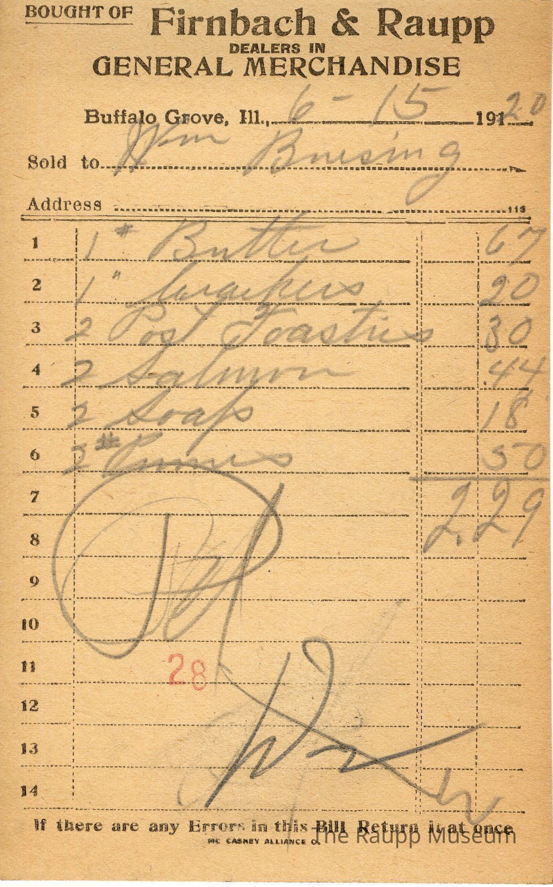 The black text is as follows, from top to bottom bought of Firnback & Raupp; Dealers in General Merchandise; Buffalo Grove, Ill.; Sold to; Address; If there are any Errors in this Bill Return it at once; MC CASKEY ALLIANCE O.Archive Details