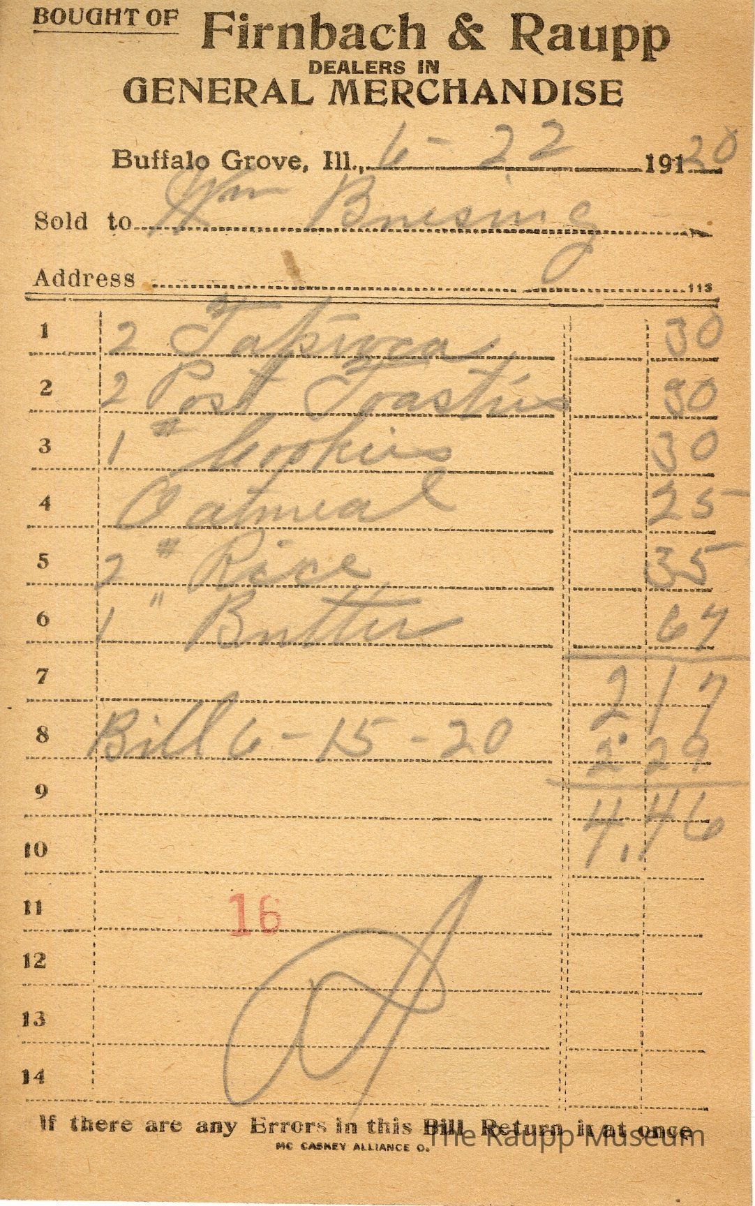 The black text is as follows, from top to bottom bought of Firnback & Raupp; Dealers in General Merchandise; Buffalo Grove, Ill.; Sold to; Address; If there are any Errors in this Bill Return it at once; MC CASKEY ALLIANCE O.Archive Details