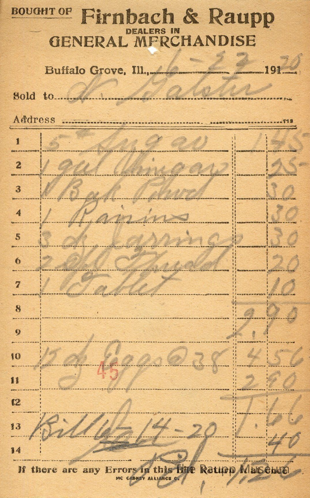 The black text is as follows, from top to bottom bought of Firnback & Raupp; Dealers in General Merchandise; Buffalo Grove, Ill.; Sold to; Address; If there are any Errors in this Bill Return it at once; MC CASKEY ALLIANCE O.Archive Details