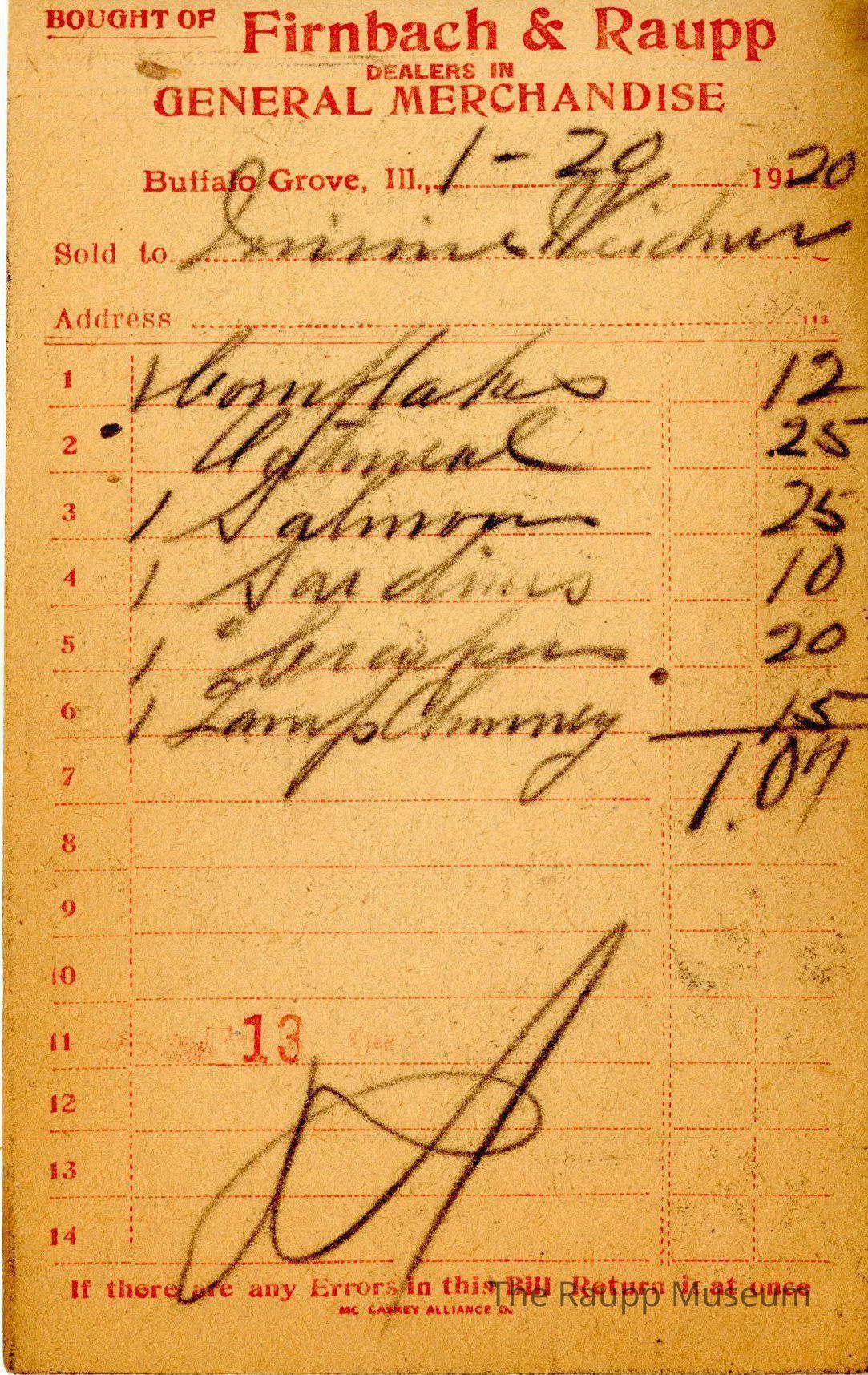 One (1) Firnbach and Raupp store receipt from January 20, 1920. Receipt is rectangular with red printed text and handwritten notes in pencil. The receipt is for Quirine Weidner who purchased one order of cornflakes for $0.12, one oatmeal for $0.25, one salmon for $0.25, one order of sardines for $0.10, one pound of crackers for $0.20, and one lamp chimney for $0.15. The bill total comes out to $1.07. On the eleventh line there is a red stamped 13 and below it the bill is marked as paid.