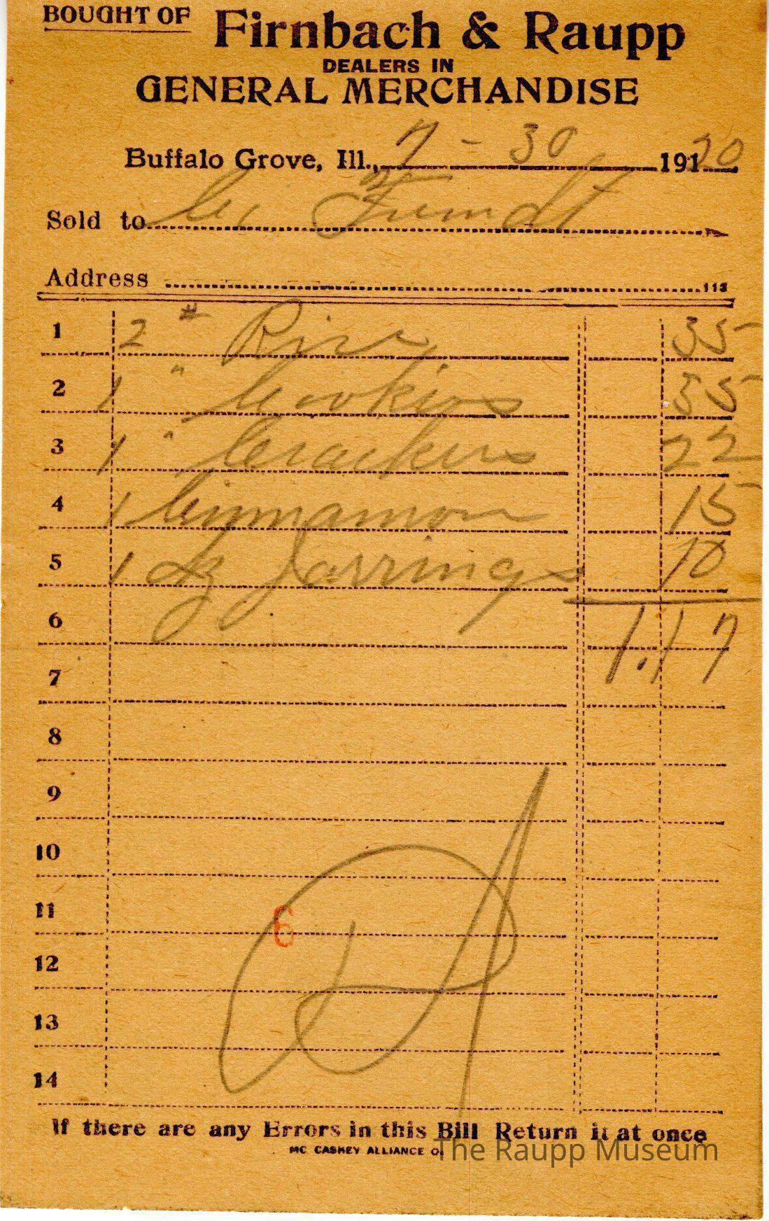 One (1) Firnbach and Raupp store receipt from July 30, 1920. Receipt is rectangular with black printed text and written notes in pencil. The receipt is for C. Fundt, who bought two pounds (#) of rice for $0.35, one pound (") of cookies for $0.35, one pound (") of crackers for $0.22, one cinnamon for $0.15, and one dozen (dz) of jarrings for $0.10. The bill total is $1.17.