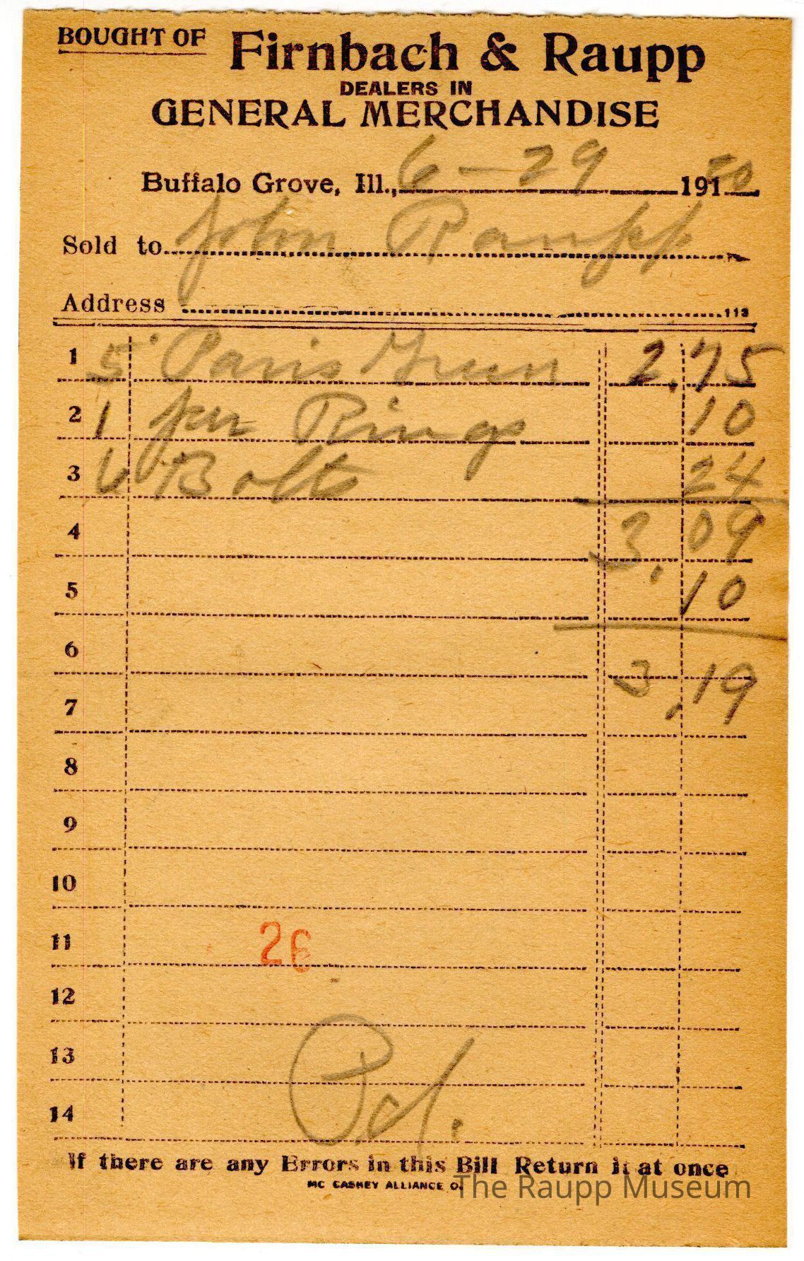 The black text is as follows, from top to bottom: "Bought of Firnbach and Raupp; Dealers in GENERAL MERCHANDISE; Buffalo Grove, Ill.; Sold to; Address; if there are any Errors in this Bill Return it at once; MC CASKEY ALIIANCE O."Archive Details