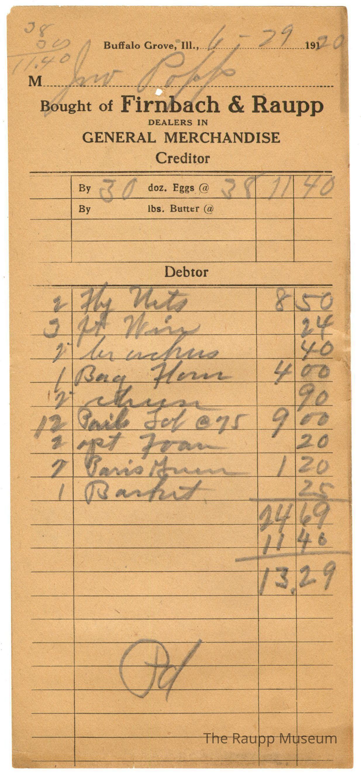 The black text is as follows, from top to bottom: Buffalo Grove, Ill., Bought of Firnbach & Raupp, Dealers in GENERAL MERCHANDISE; Creditor, By doz. Eggs @, By lbs. Butter @, DebtorArchive Details
