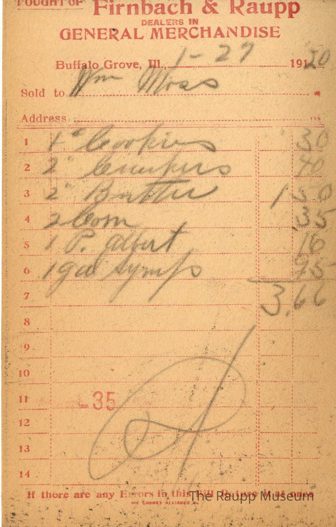 One (1) Firnbach and Raupp store receipt from January 27, 1920. Receipt is rectangular with red printed text and handwritten notes in pencil. The receipt is for Wm. (William) Moss who bought one pound of cookies for $0.30, two pounds of crackers for $0.40, two pounds of butter for $1.50, two orders of corn for $0.35, one R. albent (?) for $0.16, and one gallon of syrup for $0.95. The bill total comes out to $3.66. There is a red stamp of 35 on the eleventh line with the bill marked as paid below.