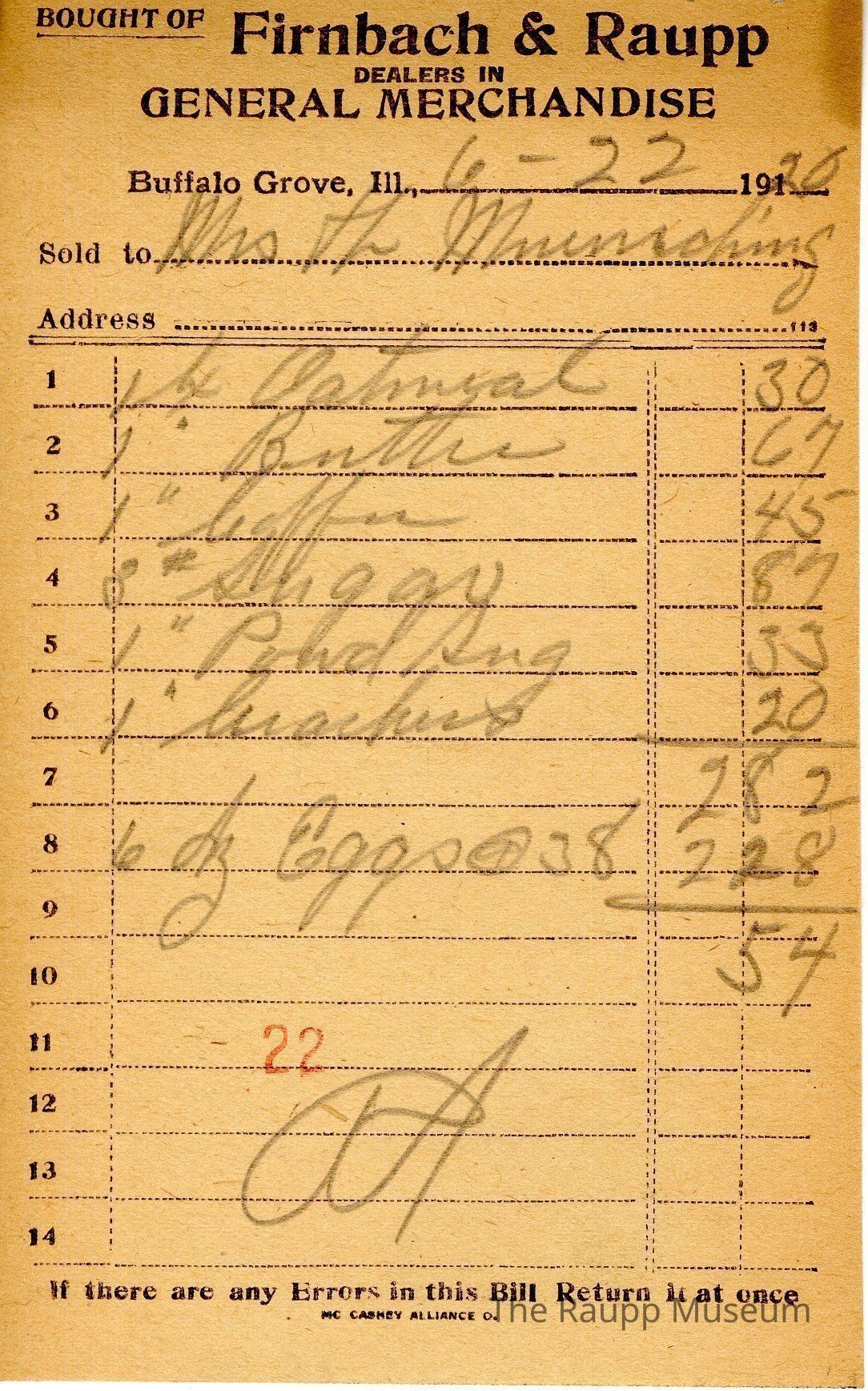 The black text is as follows, from top to bottom bought of Firnback & Raupp; Dealers in General Merchandise; Buffalo Grove, Ill.; Sold to; Address; If there are any Errors in this Bill Return it at once; MC CASKEY ALLIANCE O.Archive Details