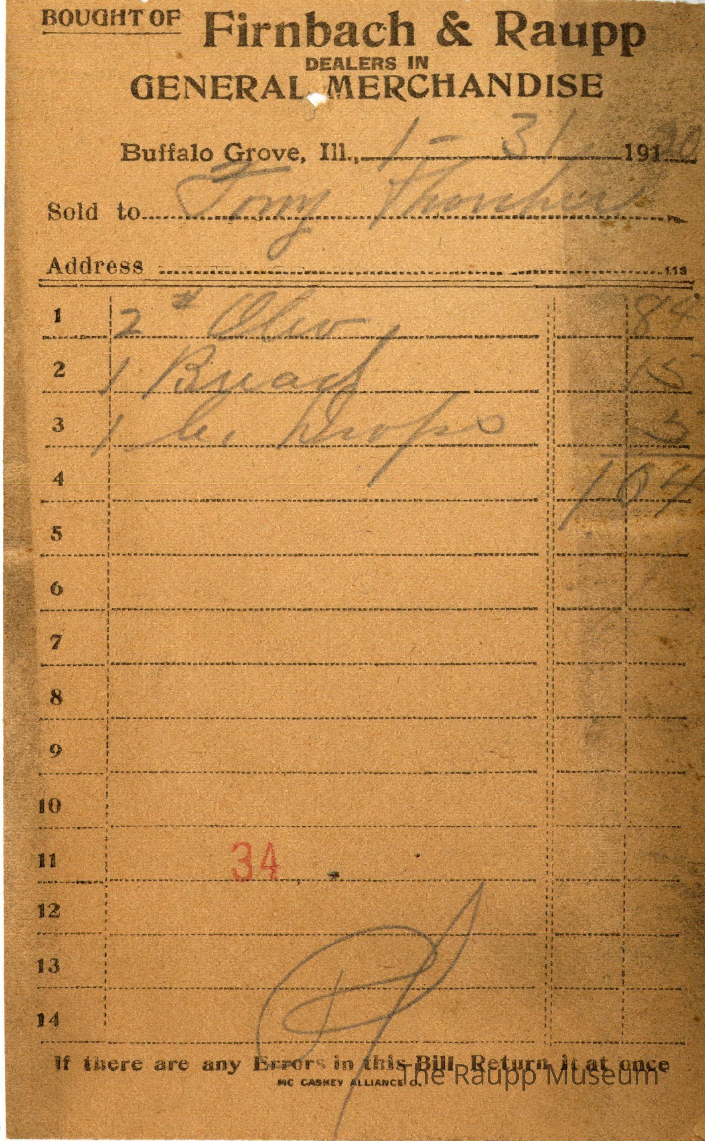 The black text is as follows, from top to bottom: "Bought of Firnbach and Raupp dealers in GENERAL MERCHANDISE" Buffalo Grove Ill.; Sold to address; if there are any Errors in this Bill Return it at once; MC CASKEY ALLIANCE O."Archive Details