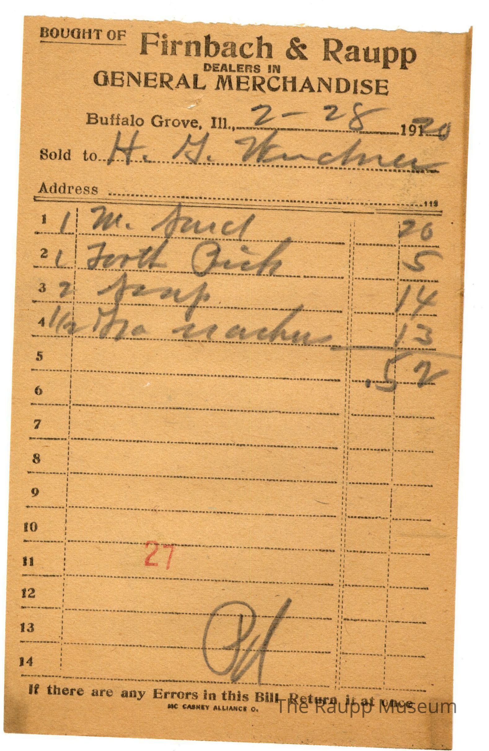 The black text is as follows, from top to bottom: "Bought of Firnbach and Raupp; Dealers in GENERAL MERCHANDISE; Buffalo Grove, Ill.; Sold to; Address; if there are any Errors in this Bill Return it at once; MC CASKEY ALLIANCE O."Archive Details