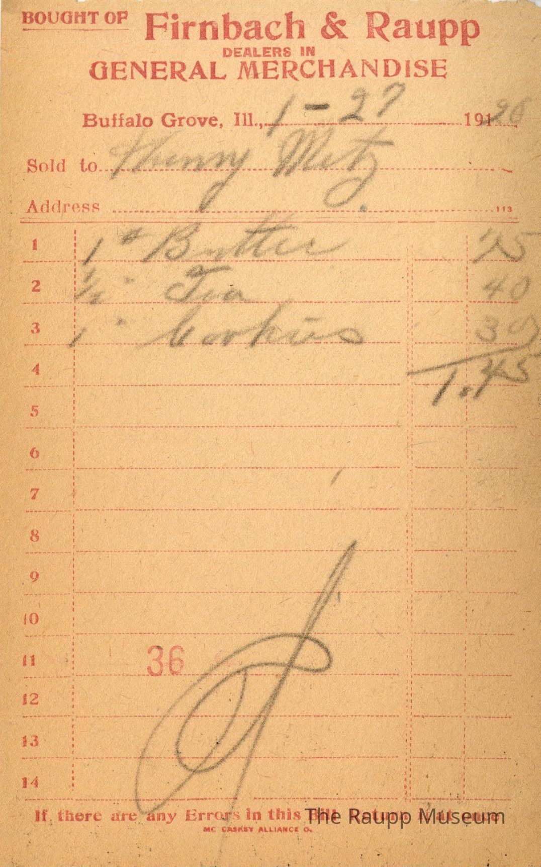 One (1) Firnbach and Raupp store receipt from January 27, 1920. Receipt is rectangular with red printed text and handwritten notes in pencil. The receipt is for Henry Metz who bought one pound of butter for $0.75, a half pound of tea for $0.40, and one pound of cookies for $0.30. The bill total comes out to $1.45. There is a red stamp of 36 on the eleventh line with the bill marked as paid below.
